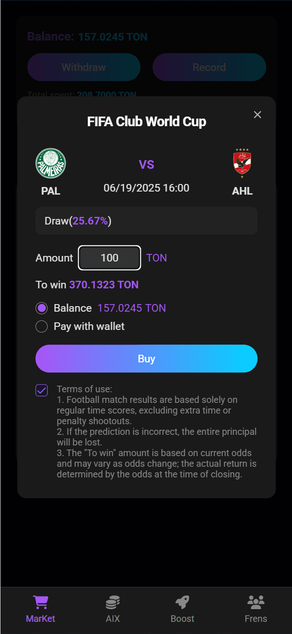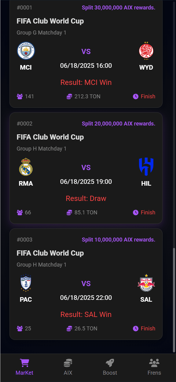 Добро пожаловать на рынок AIX! Это платформа прогнозирования в экосистеме TON, призванная стать версией Polymarket для Web3! Здесь вы можете: