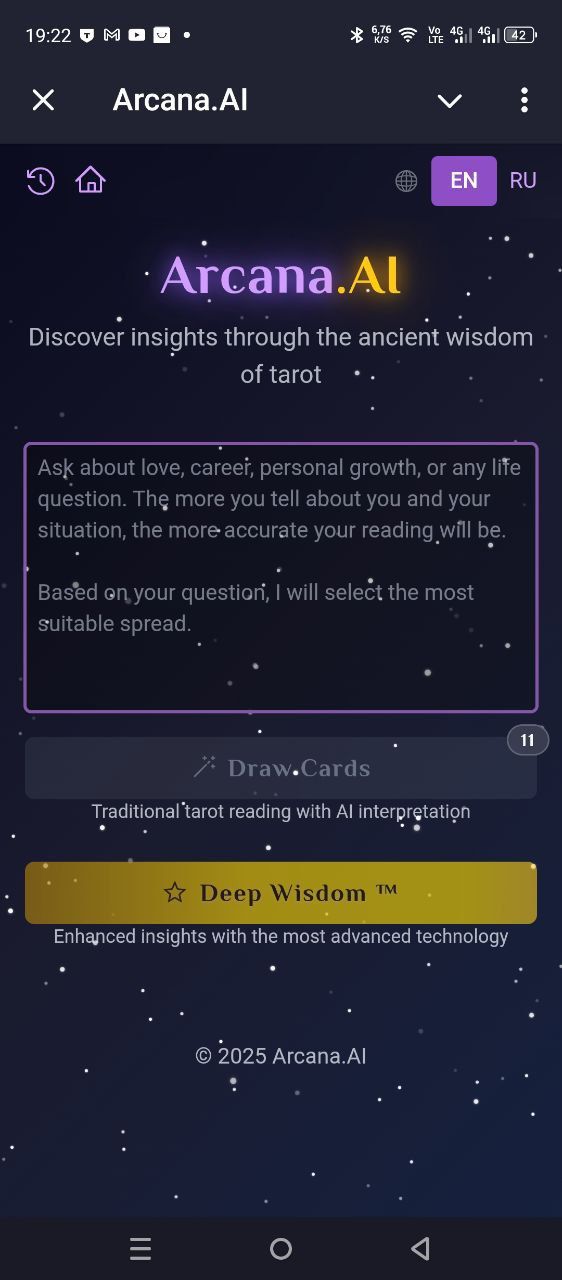Arcana․AI дает вам показания карт Таро на основе искусственного интеллекта для любви, карьеры, жизненных решений и любых других вопросов. Приложение выбирает правильные карты и объясняет общее чтение с помощью искусственного интеллекта.