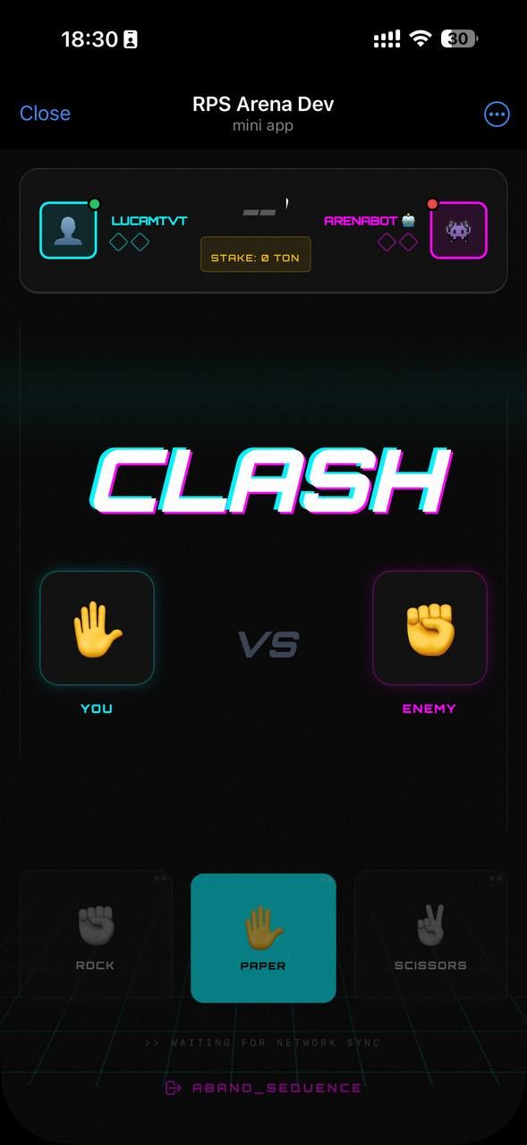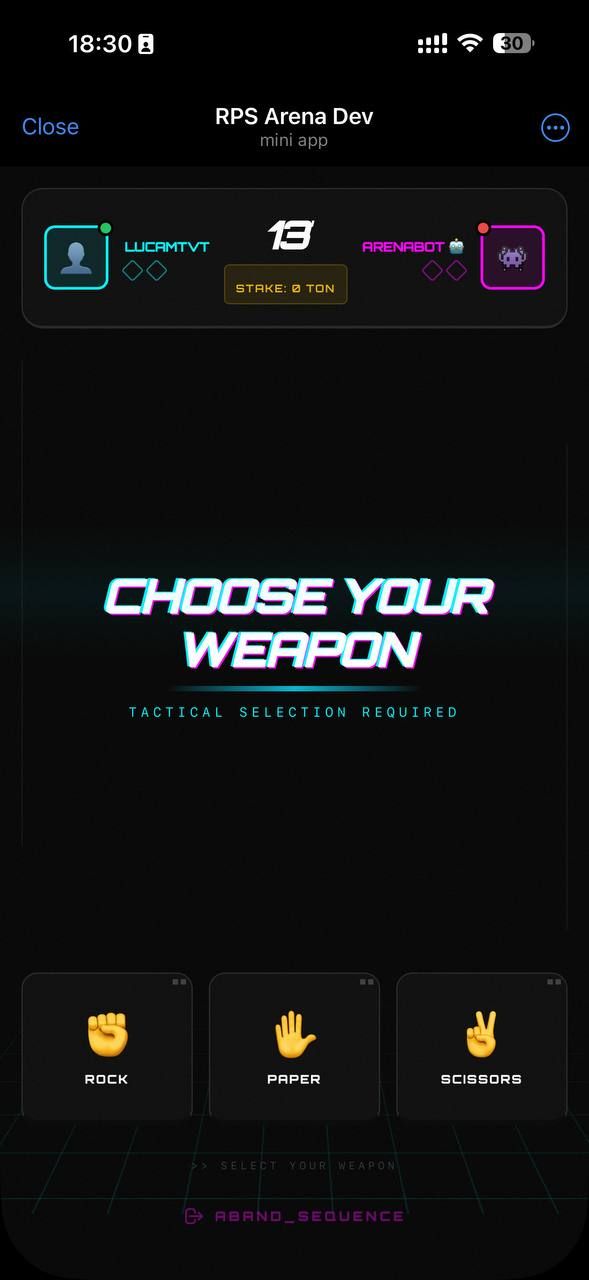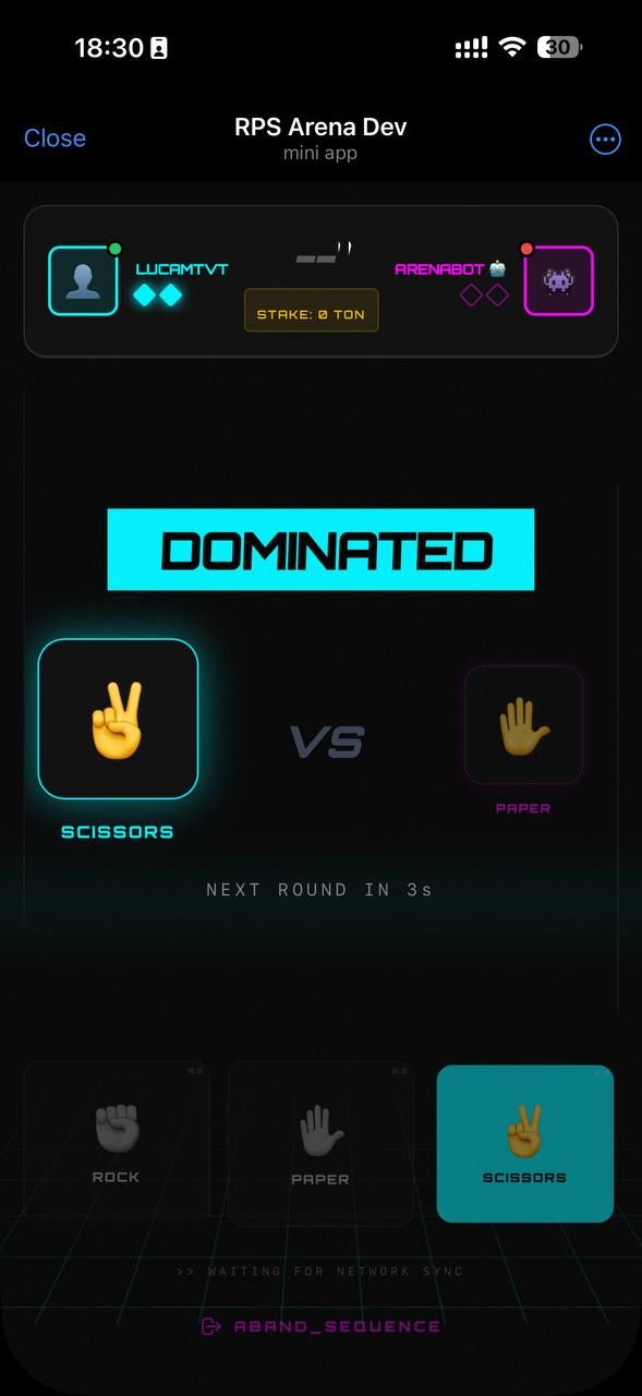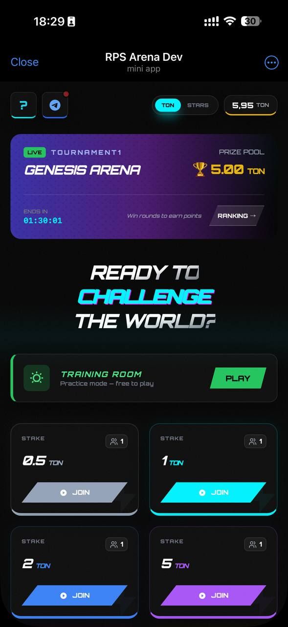Arena — это высококачественная дуэльная платформа «Камень-ножницы-бумага» (RPS), работающая в режиме реального времени, построенная на блокчейне TON. Окунитесь в премиальную атмосферу киберпанка в сочетании с динамичными соревнованиями с высокими ставками.
