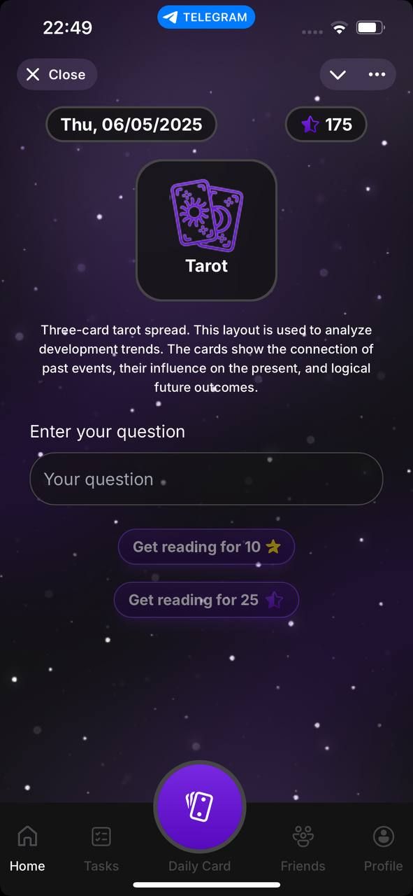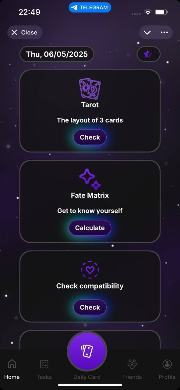 Astro — это удобное ежедневное приложение, которое предлагает персонализированные рекомендации с помощью ежедневных карточек с вдохновляющими сообщениями. Вы можете выполнить чтение Таро, чтобы найти ответы на свои вопросы, изучить подробный анализ Матрицы Судьбы для более глубокого самопознания и проверить совместимость с другими. Вскоре в приложении также появится генератор натальной карты, синхронизация лунного календаря и инструменты для записи аффирмаций и прослушивания управляемых медитаций – все это призвано помочь вам ориентироваться в жизни с ясностью и пониманием.