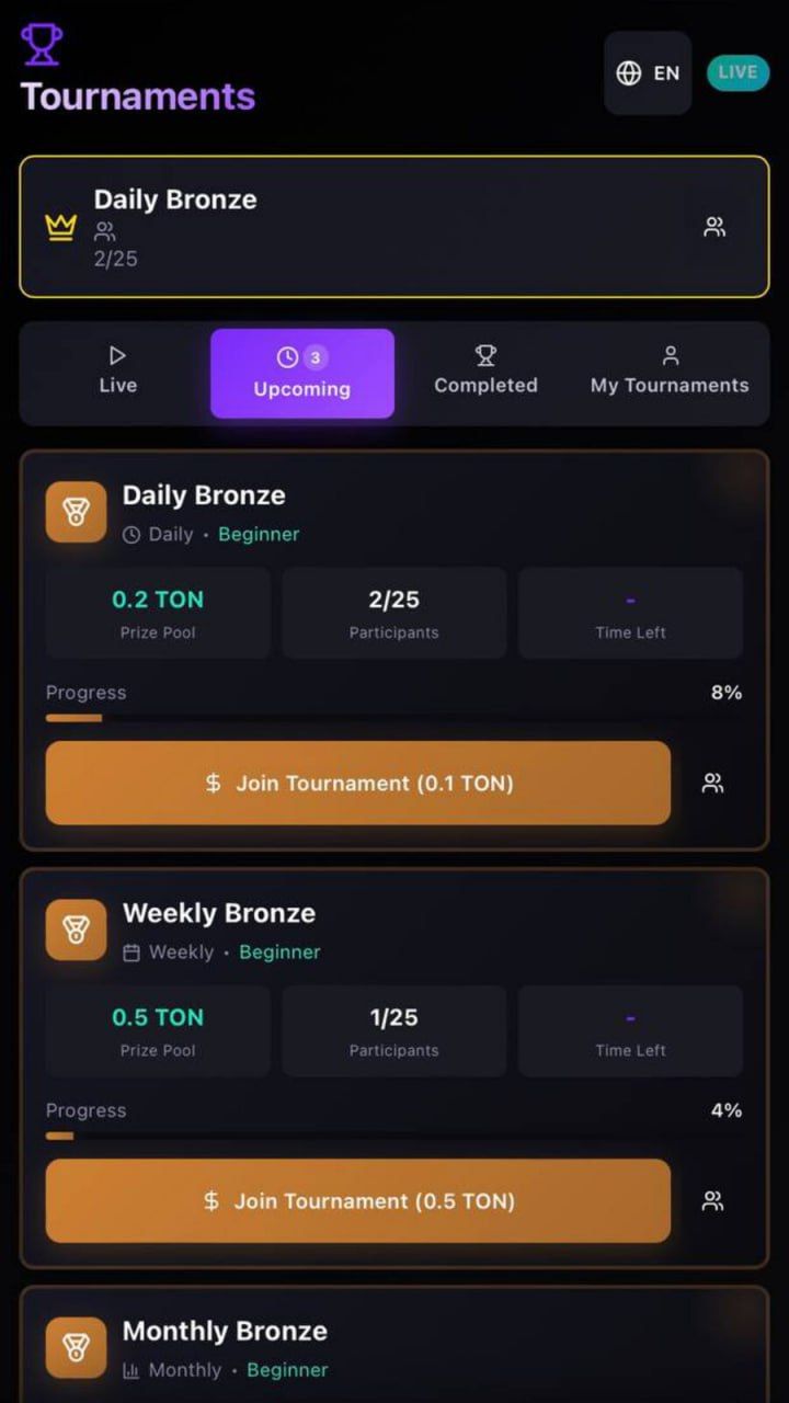 BCFuture — это торговая и обучающая платформа для трейдеров с возможностью практиковаться на демо-счете $BC, торговать парами в сети TON и участвовать в турнирах за призы в TON.