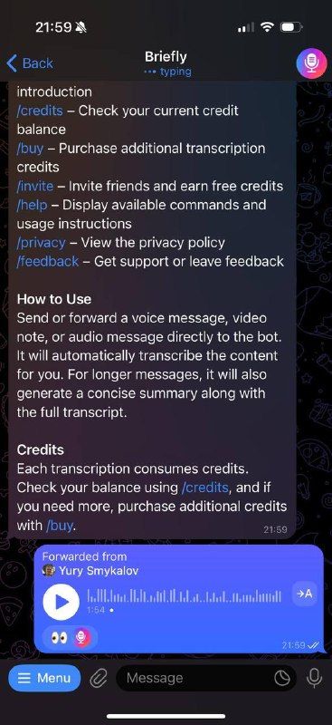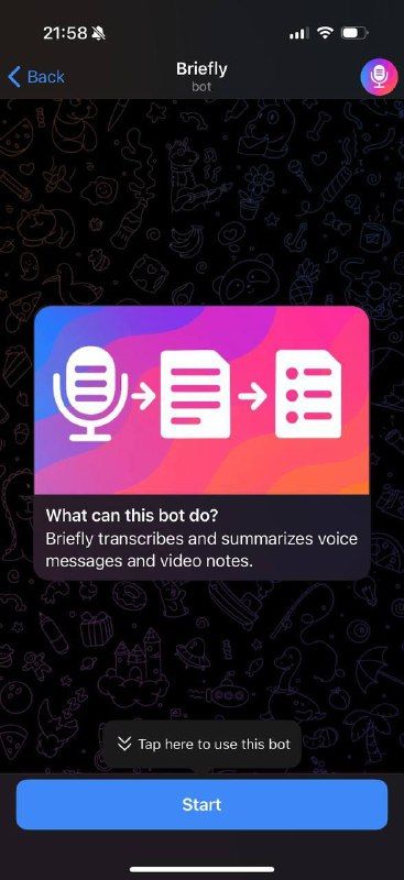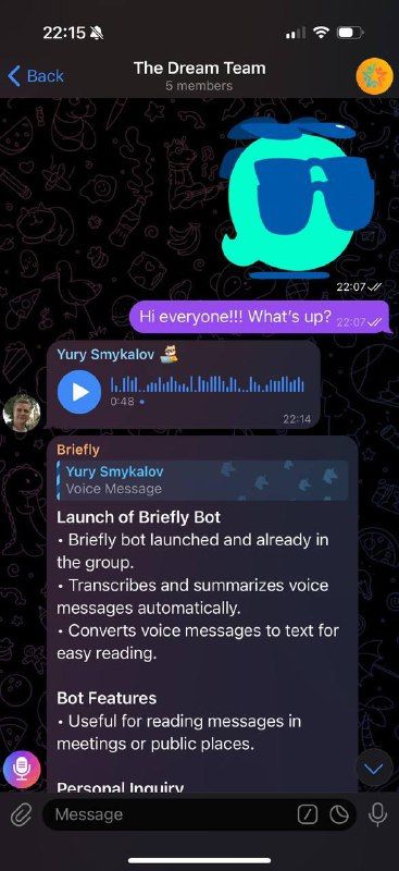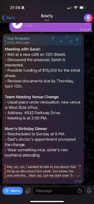 Briefly — это бот Telegram, который расшифровывает и обобщает голосовые сообщения, аудиозаписи и видеозаметки. Работает в приватных чатах, группах и каналах. Вы можете переслать боту любое голосовое или видеосообщение и получить понятную расшифровку и краткое изложение ключевых моментов. Для коротких сообщений предоставляется расшифровка. Для более длинных изданий создается структурированное резюме с пунктами и разделами. Кратко поддерживает до 2 часов или 2 ГБ на сообщение и работает на 99 языках.