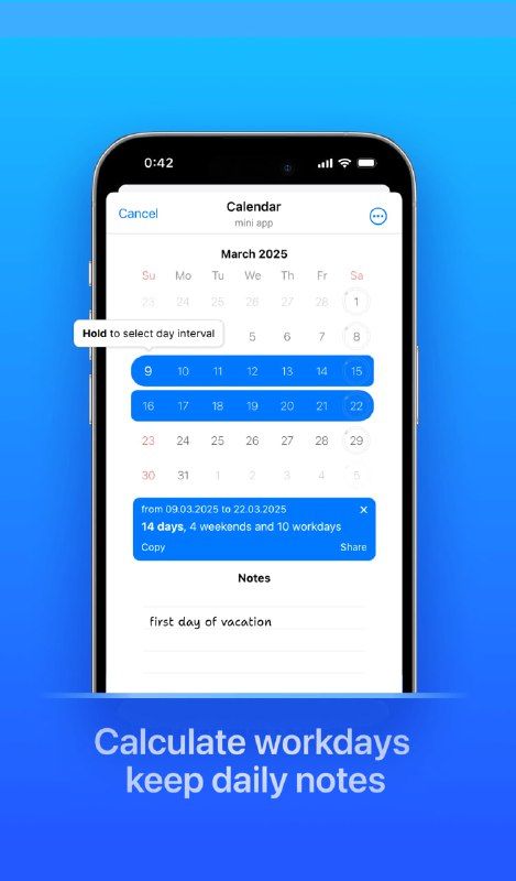 Вы можете создавать свои расписания/группы событий и делиться ими со своими подписчиками. Или поделитесь своим расписанием с партнером, чтобы планировать время вместе и всегда знать, кто и когда доступен. Визуальный календарь, отображающий праздничные и нерабочие дни в вашей стране, поможет в планировании поездок и отпуска.