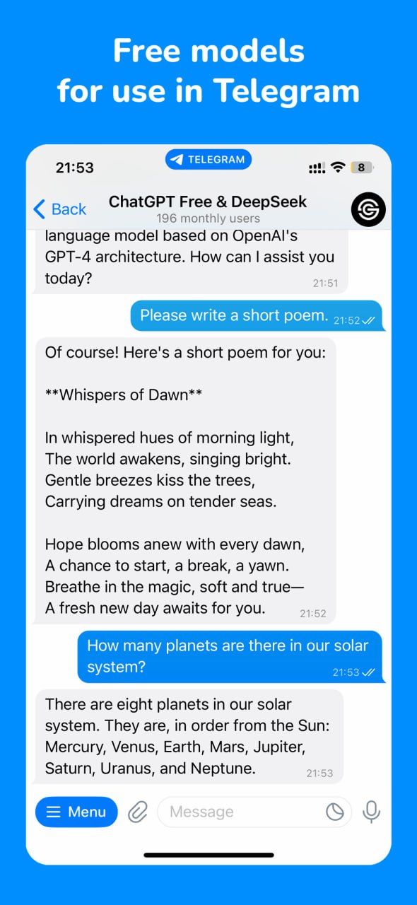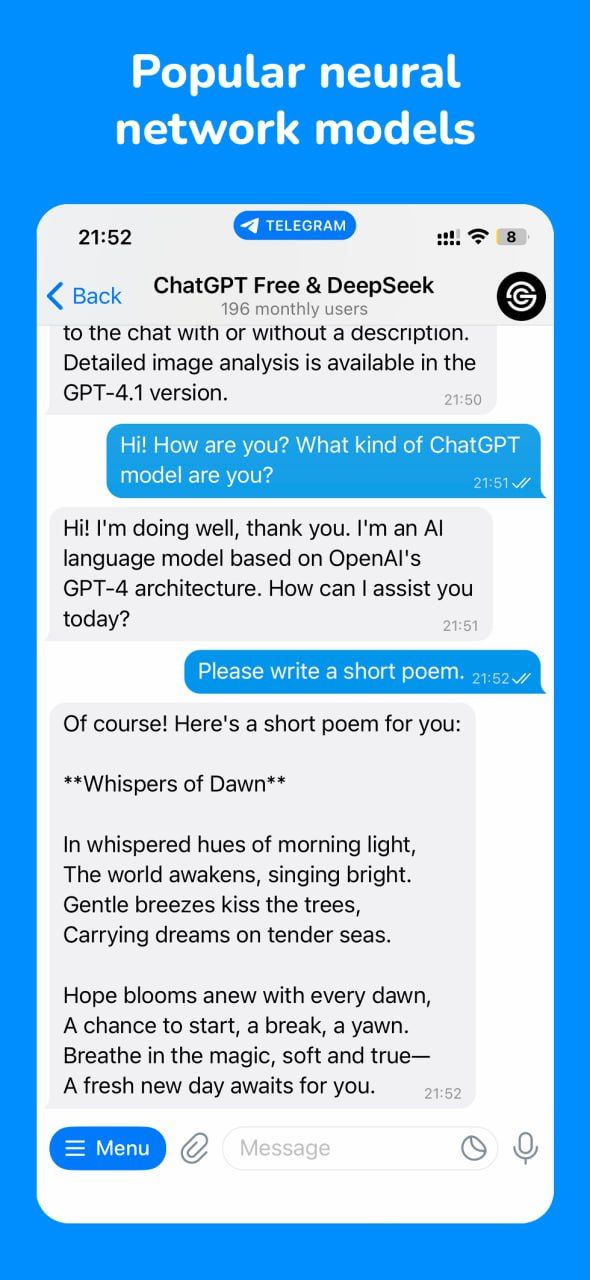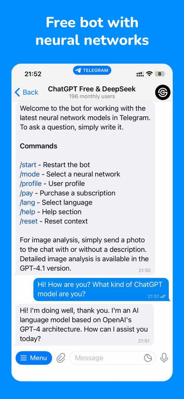 Используйте популярные модели нейронных сетей в Telegram. ChatGPT, DeepSeek и другие искусственные интеллекты, которые помогают в работе, учебе, общении и программировании. Есть контекстная поддержка, бесплатные лимиты и дешевая подписка.