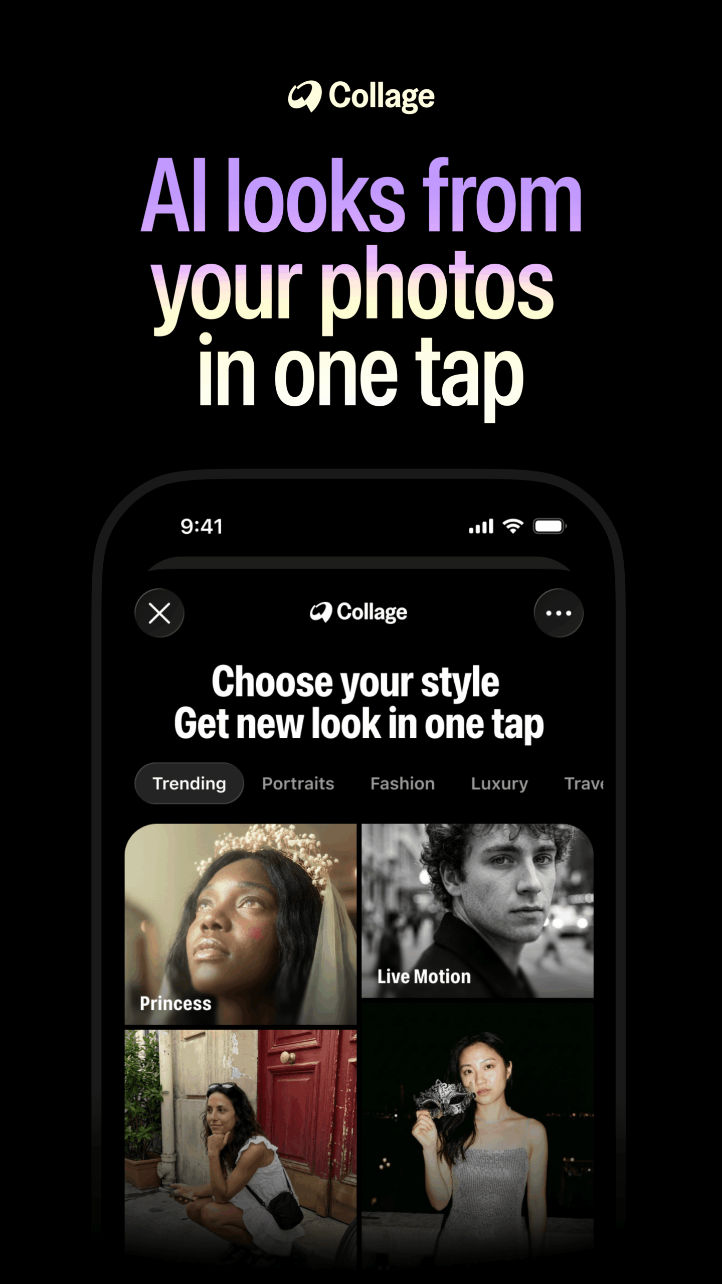 Коллаж представляет собой тщательно подобранные стили, созданные авторами. Идеально подходит для историй, фотосессий, аватаров, обложек профилей и личного брендинга. Попробуйте «Коллаж» — ваши первые образы бесплатны.