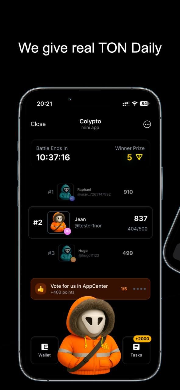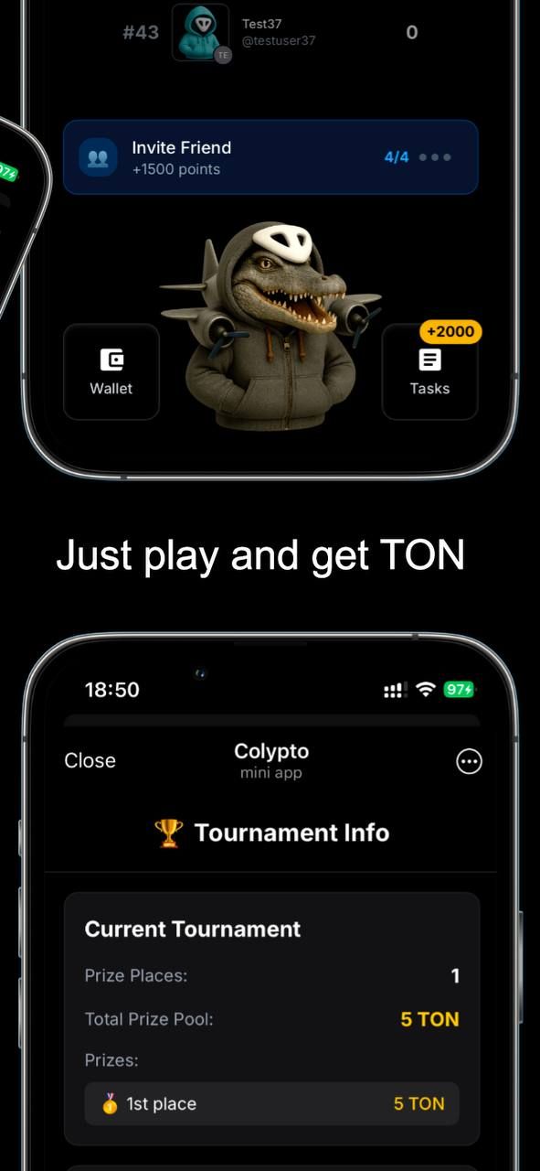 Colypto — эпический турнир. Основная цель – набрать наибольшее количество очков и обогнать своих соперников в таблице лидеров. Турнир длится 24 часа, каждый день. Игроки, занявшие первые места, получают TON на свой кошелек в тот же день!