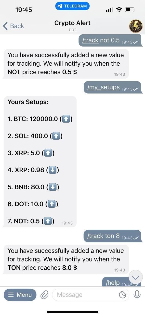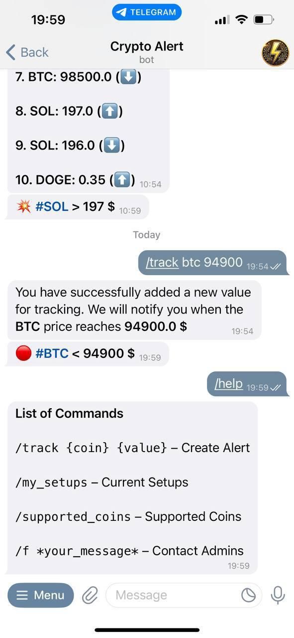 Будьте впереди рынка с помощью этого мощного бота для оповещения о ценах на криптовалюту. Установите целевые цены для сотен поддерживаемых монет и получайте мгновенные уведомления в тот момент, когда желаемая цена будет достигнута. Разработанный для скорости, простоты и глобальной доступности, бот предлагает многоязычную поддержку и удобный интерфейс, который поможет вам легко отслеживать рынок.