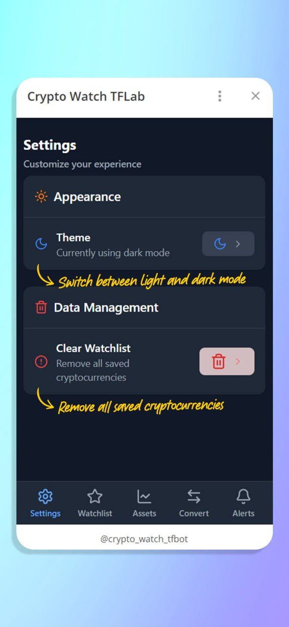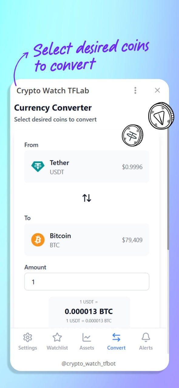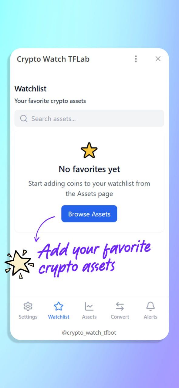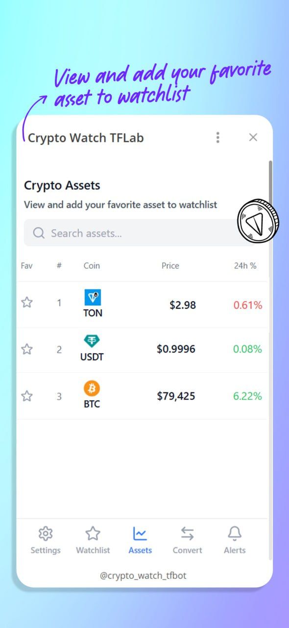 Crypto Market Watch — это мини-приложение для Telegram, которое позволяет в режиме реального времени отслеживать более 16 000 цифровых активов (BTC, ETH, BNB).