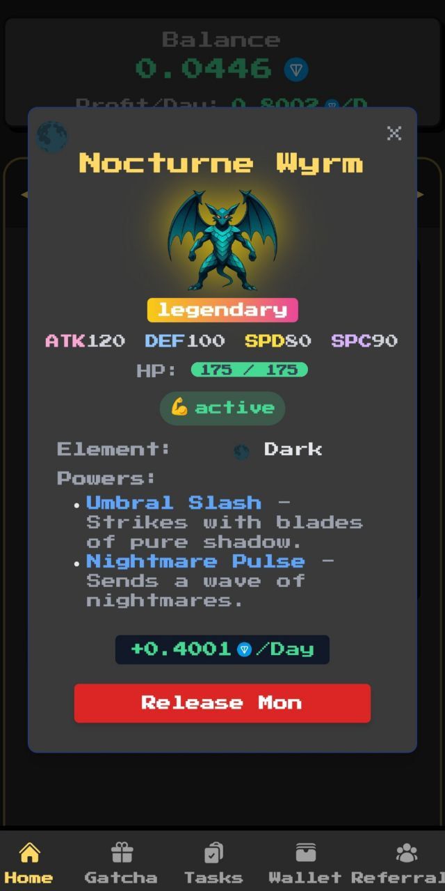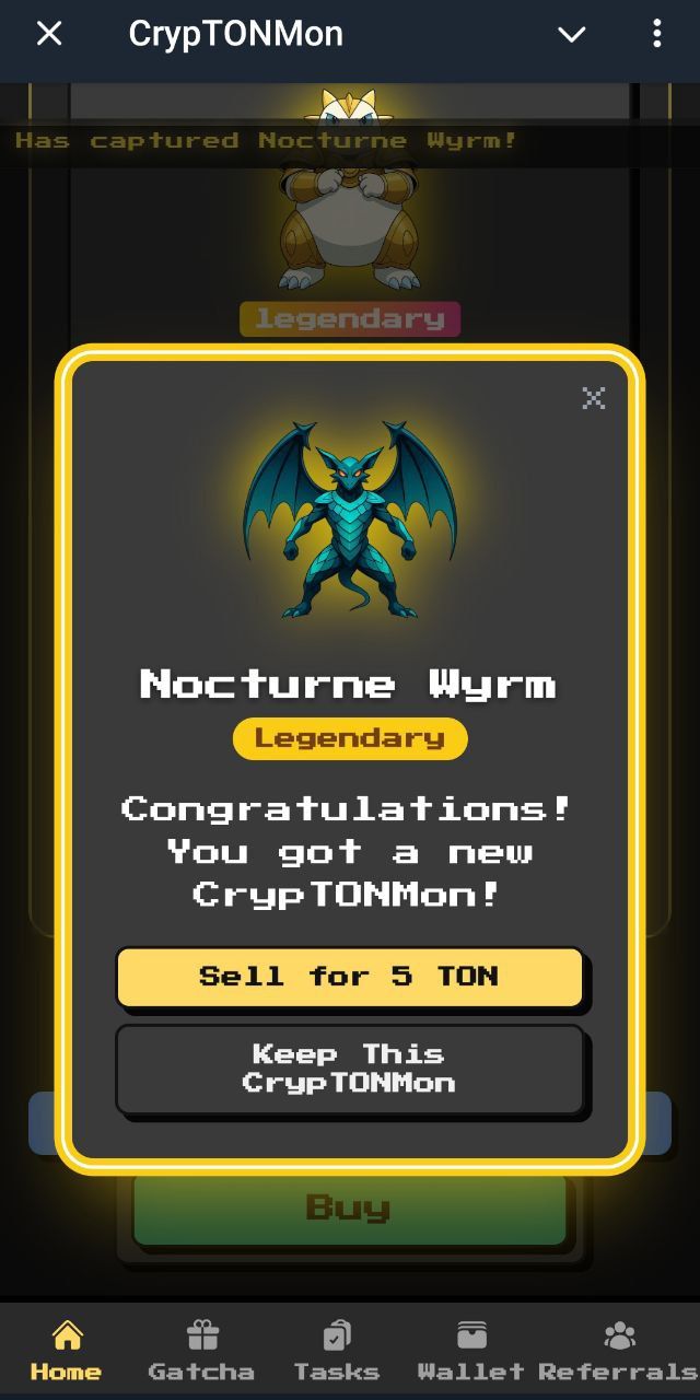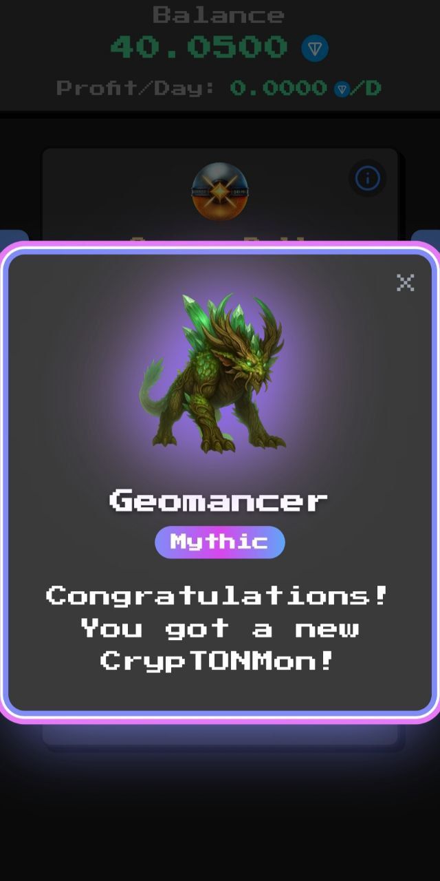 CrypTONMon — это гатча-игра для зарабатывания денег в Telegram. Собирайте редкие и легендарные CrypTONMons, сражайтесь с другими игроками, зарабатывайте награды и приглашайте друзей, чтобы увеличить свои награды. Открывайте шары гатчи, открывайте новых монстров и поднимайтесь в таблице лидеров!