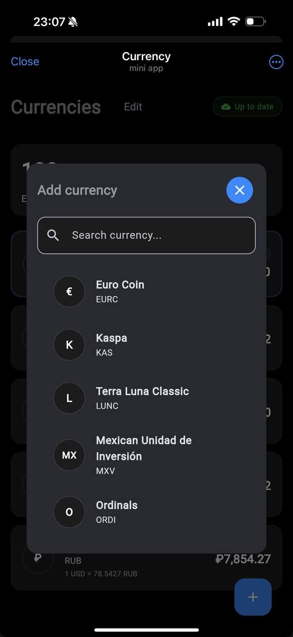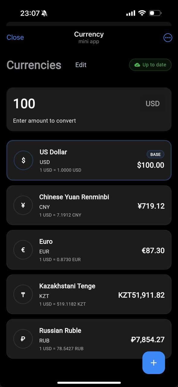 Currencis — это быстрый и интуитивно понятный конвертер валют, разработанный специально для пользователей Telegram. Просто введите любую сумму и мгновенно увидите конверсии в реальном времени по всем выбранным вами валютам. Приложение имеет понятный одностраничный интерфейс, в котором вы можете легко настроить список валют, добавляя или удаляя валюты в зависимости от ваших личных потребностей или направлений путешествия.