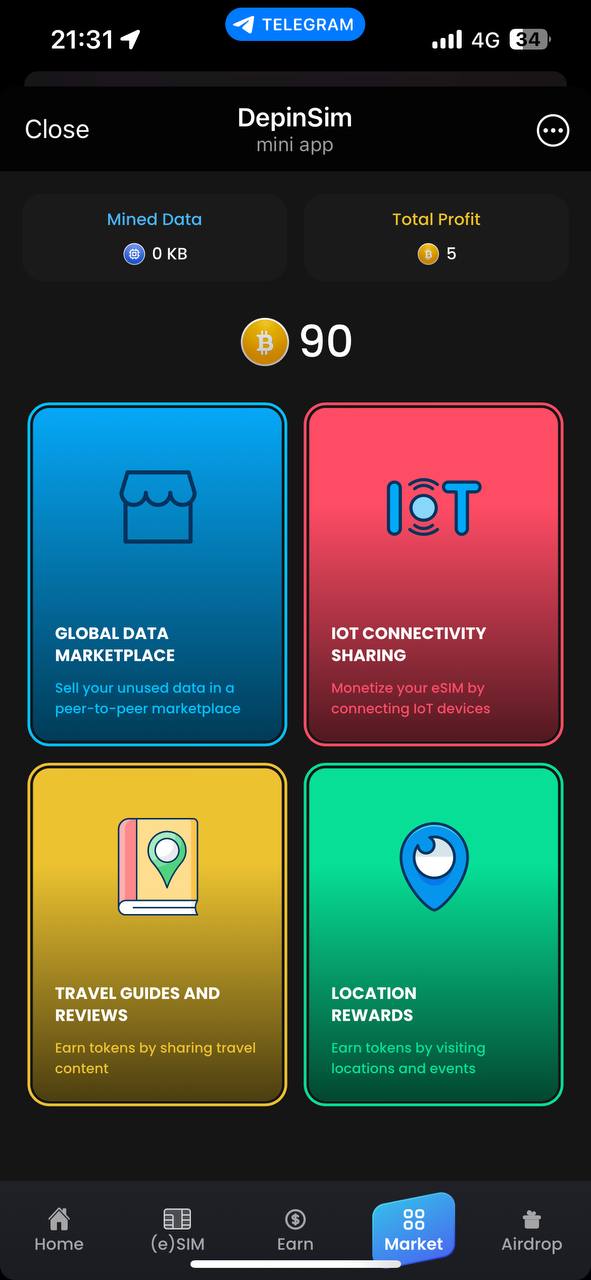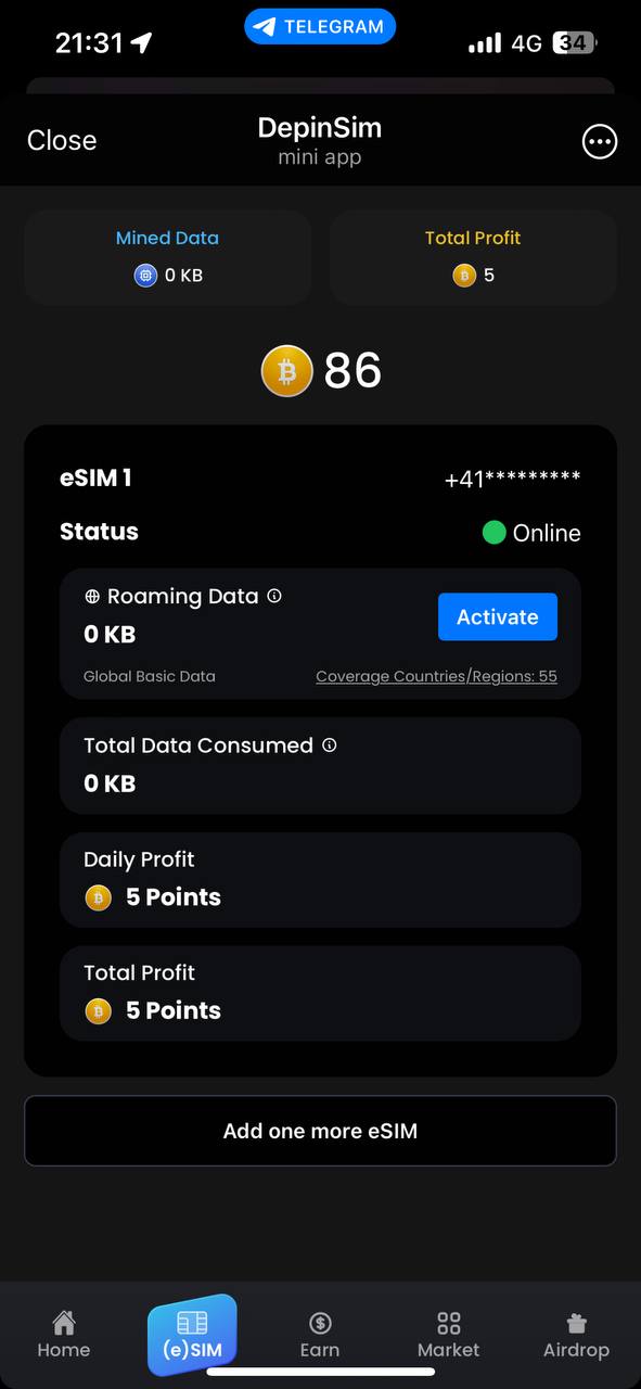 Depinsim — это приложение Telegram, созданное на основе блокчейна TON (The Open Network), которое позволяет пользователям покупать eSIM и пополнять данные в роуминге криптовалютами. Пользователи также могут зарабатывать очки, выполняя различные задания в приложении или играя в мини-игры. Эти баллы можно использовать для получения различных вознаграждений, таких как данные в роуминге, VIP-подписки и будущие раздачи.