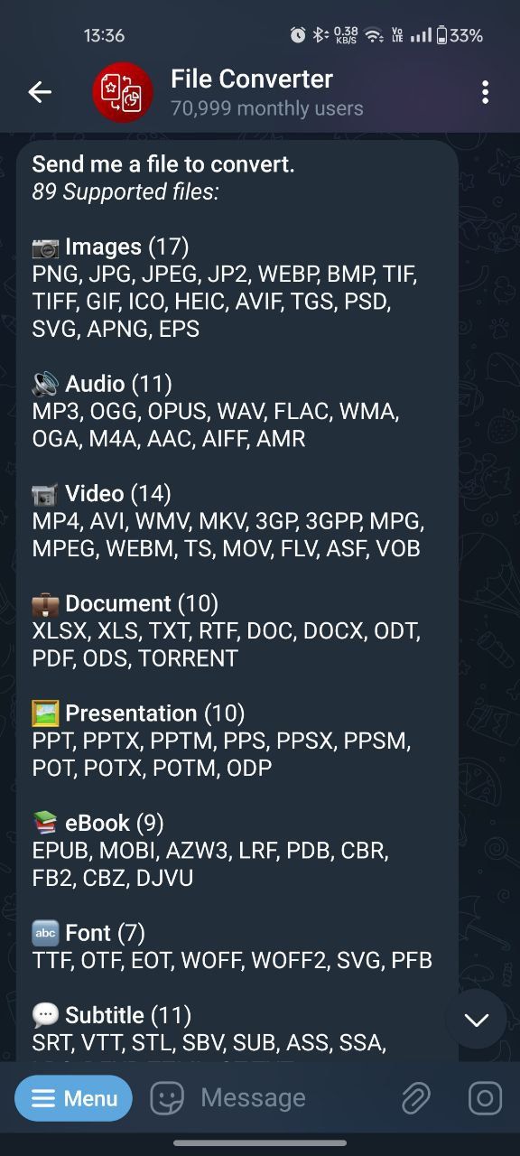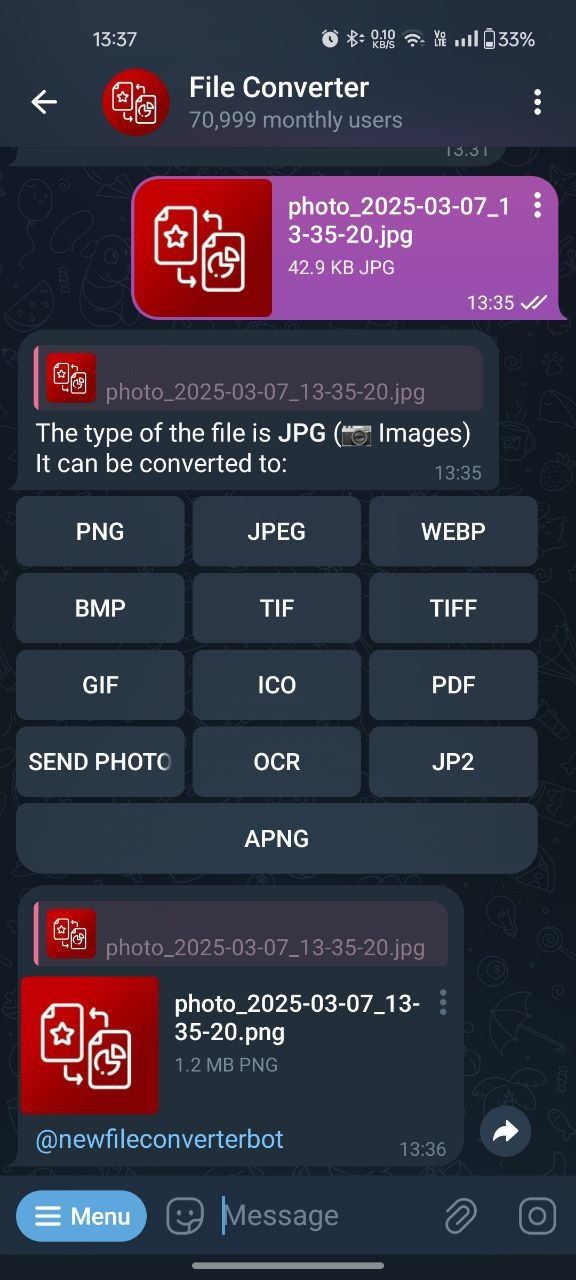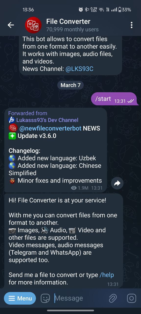 Этот бот упрощает преобразование файлов, поддерживая форматы изображений, аудио и видео. Быстро преобразуйте файлы из одного формата в другой всего несколькими нажатиями!