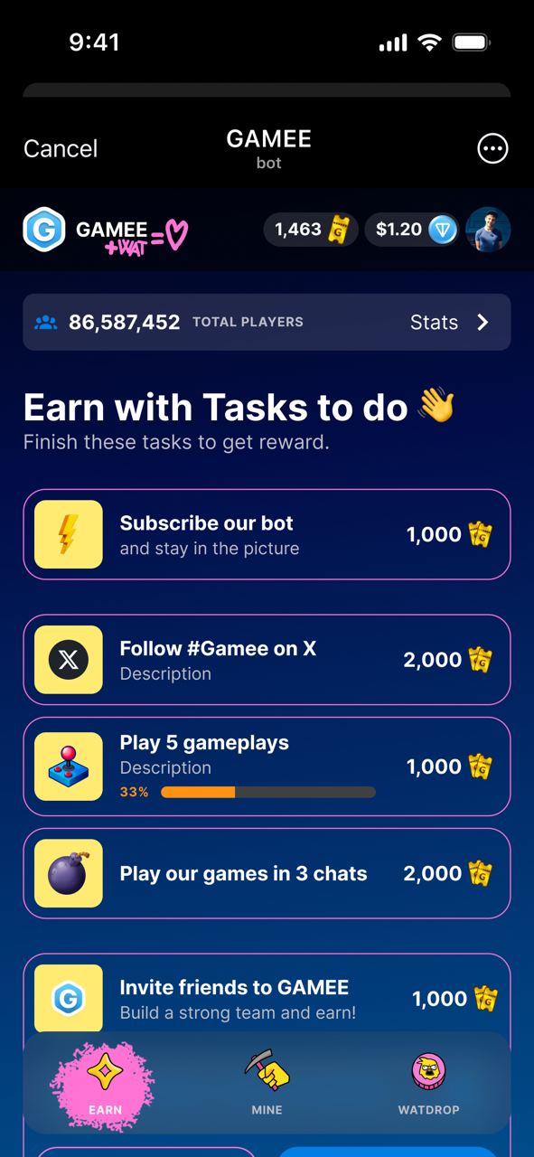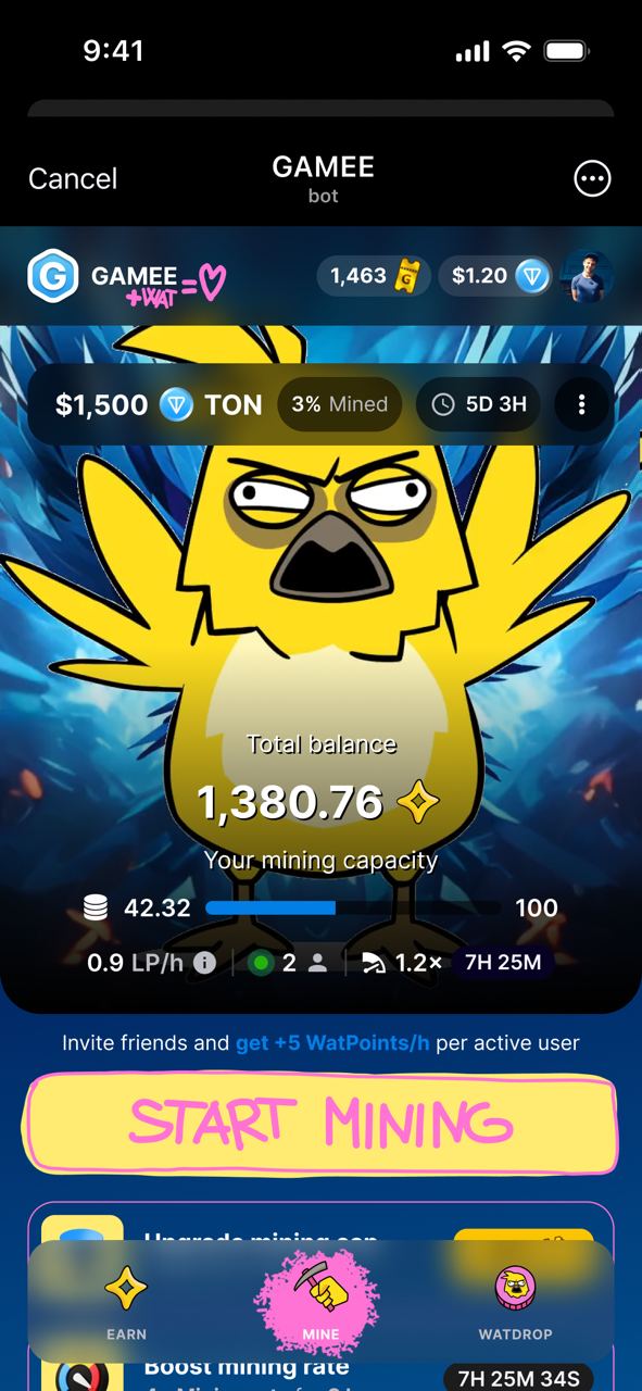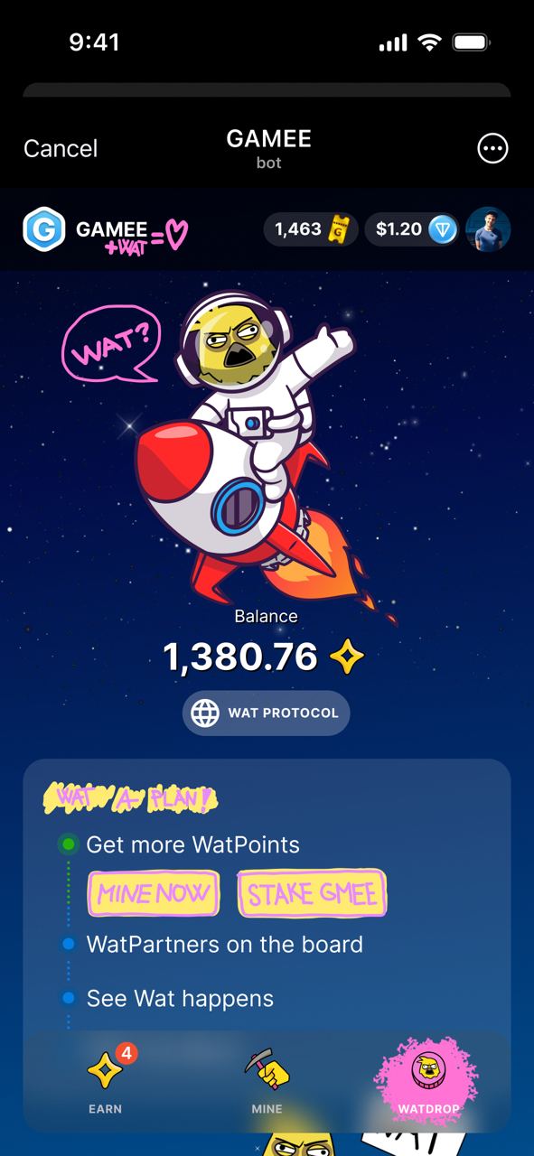 Что? Готовы присоединиться к крупнейшей игровой платформе Telegram? Приходите посмотреть, что мы собой представляем. Добывайте WatPoints. Приглашайте друзей в свою команду — добывайте больше WatPoints! Что дальше? Wateva.