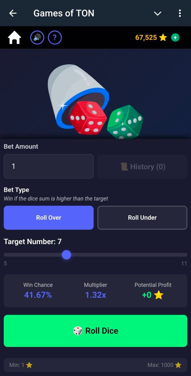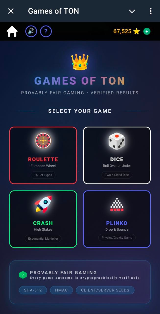 Games of TON переносит развлечения в стиле казино прямо в Telegram. Играйте в рулетку, кости и другие игры, используя только Telegram Stars — никаких реальных денег и криптовалютных кошельков не требуется. Каждая игра является доказуемо честной: используется криптографическая проверка, поэтому вы можете независимо подтвердить каждый результат. Быстрый, бесплатный запуск и созданный для экосистемы TON.