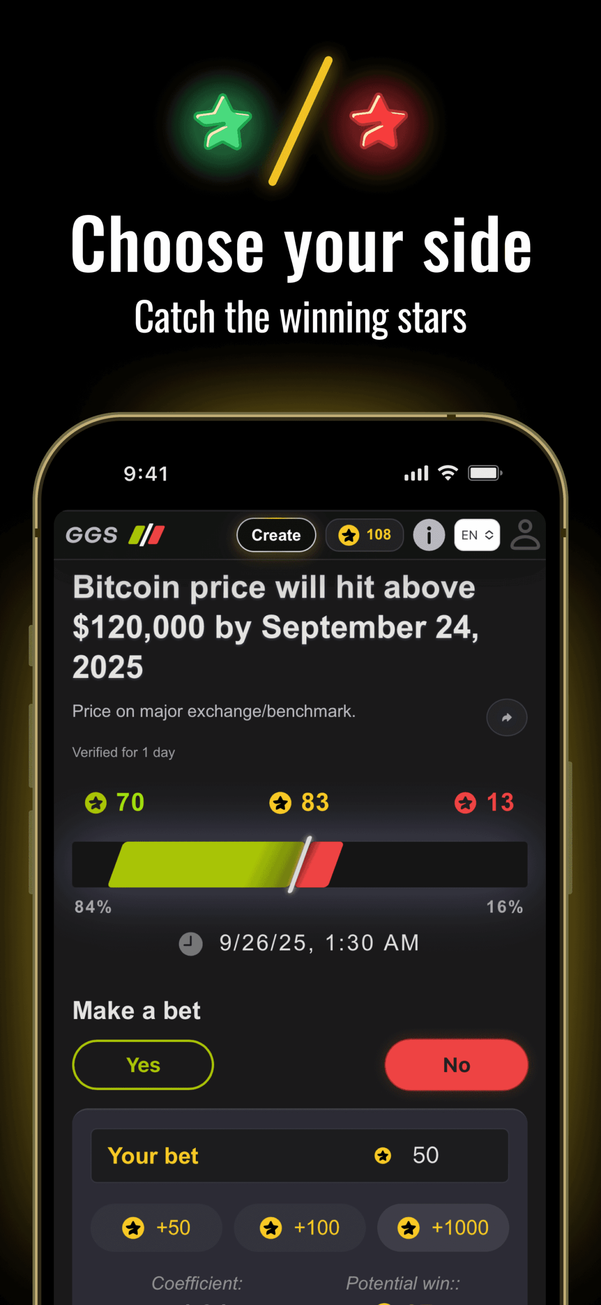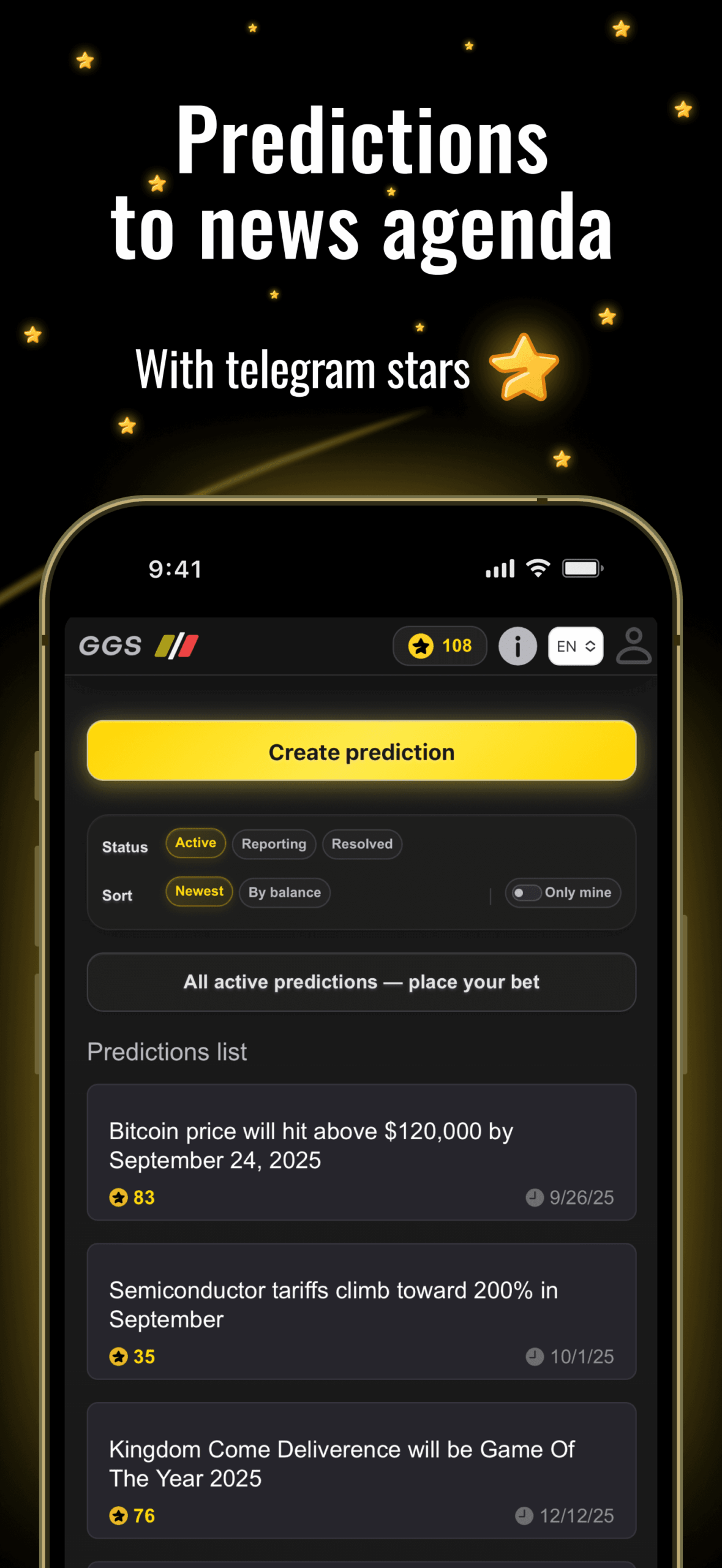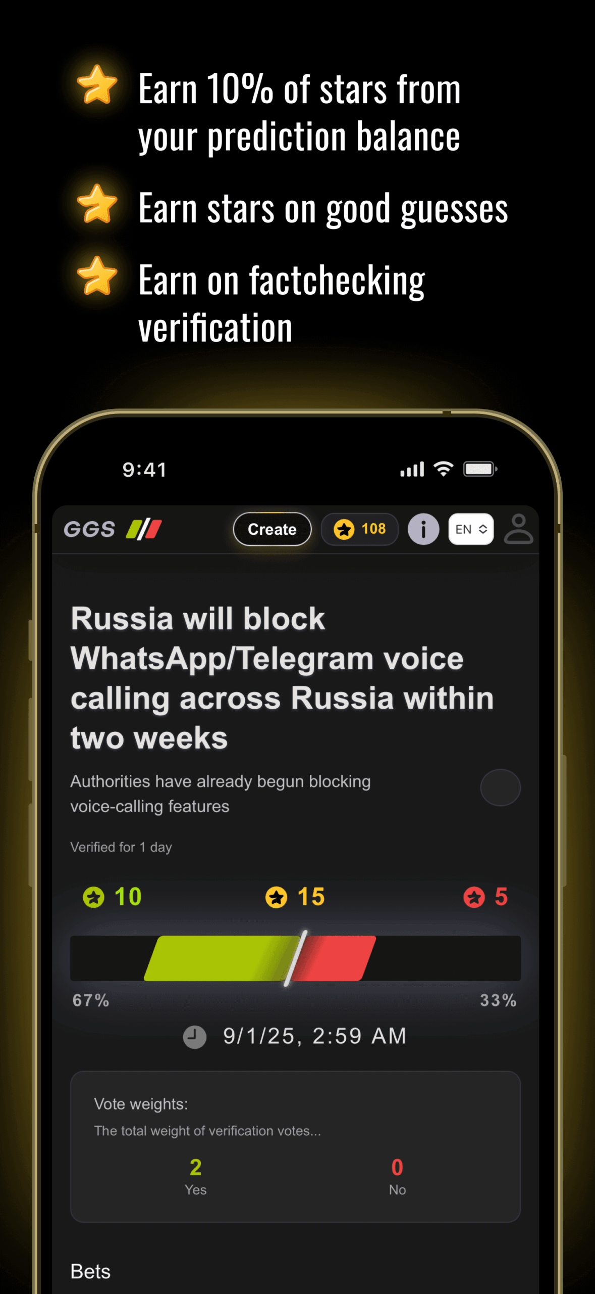 GGS — это рынок социальных прогнозов, где вы создаете бинарные результаты и обмениваетесь ими с сообществом. Делайте ставки «да/нет», зарабатывайте на выигрышных прогнозах, зарабатывайте долю от всех ставок, сделанных на ваши собственные прогнозы, и получайте награды за голоса при проверке правильных результатов. Наслаждайтесь беспрепятственными депозитами через Telegram Stars и выводом средств на свой кошелек TON. Результаты определяются посредством отчетов сообщества и голосования, взвешенного по репутации, чтобы обеспечить справедливость.