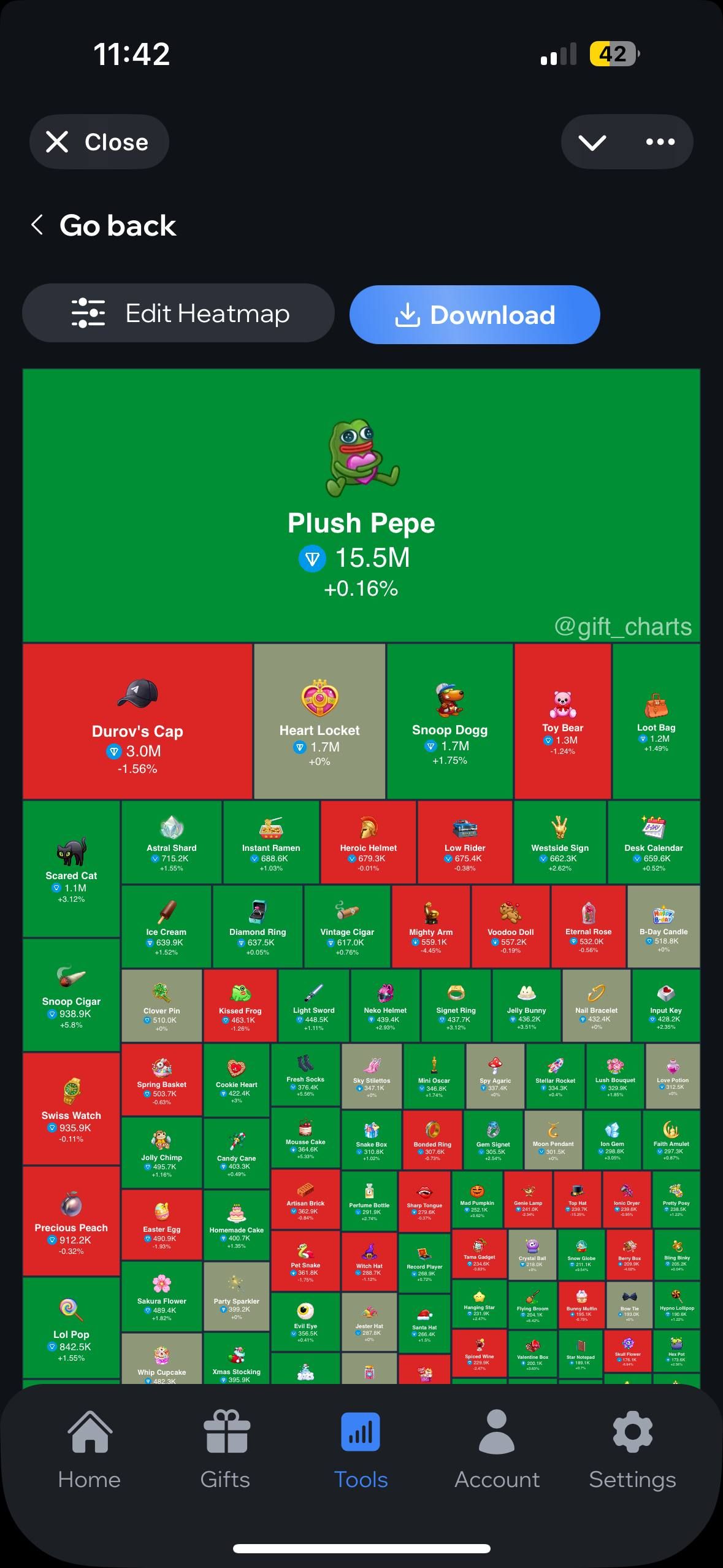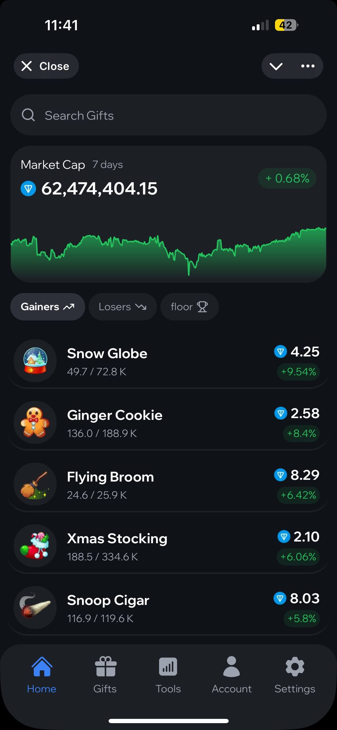 Gift Charts — это аналитическое приложение, которое объединяет данные со всех основных торговых площадок, чтобы помочь пользователям отслеживать цены, тенденции и стоимость портфеля подарков Telegram NFT.