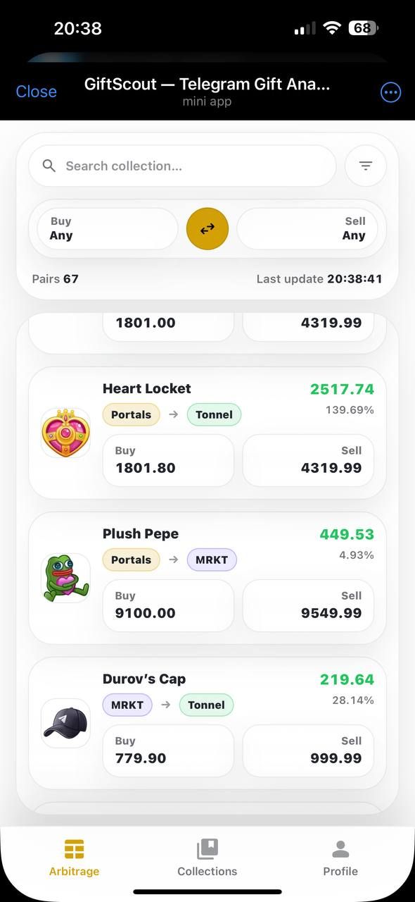 Пользователи могут просматривать коллекции подарков, сравнивать цены покупки и продажи на разных рынках и видеть предполагаемую прибыль после комиссий. GiftScout постоянно обновляет данные и выделяет лучшие текущие маршруты для покупки и продажи.
