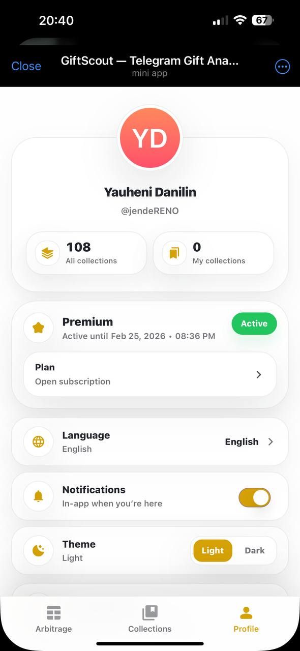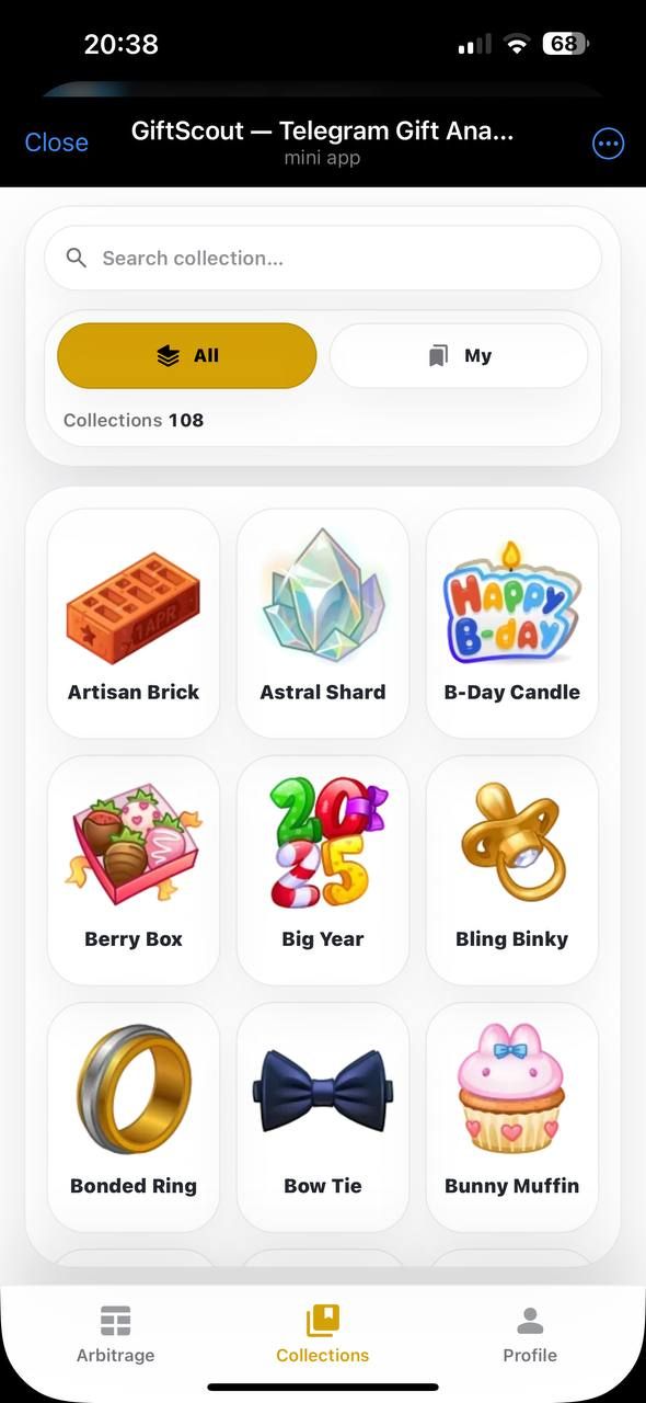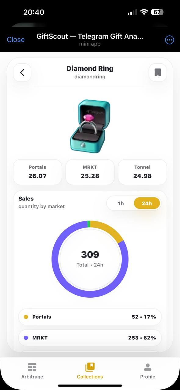 GiftScout предоставляет аналитику подарков Telegram в режиме реального времени на нескольких торговых площадках. Приложение отслеживает минимальные цены, комиссии, спреды и недавнюю активность продаж, чтобы помочь пользователям понять рынок и выявить выгодные возможности арбитража.