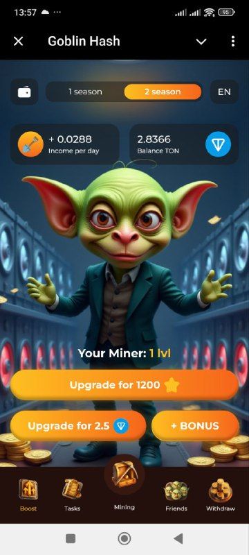 Goblin Mine — экономическая игра, в которой ваша миссия — увеличивать производство, добывать монеты TON и соревноваться с другими игроками. А также собирать жетоны GHG.