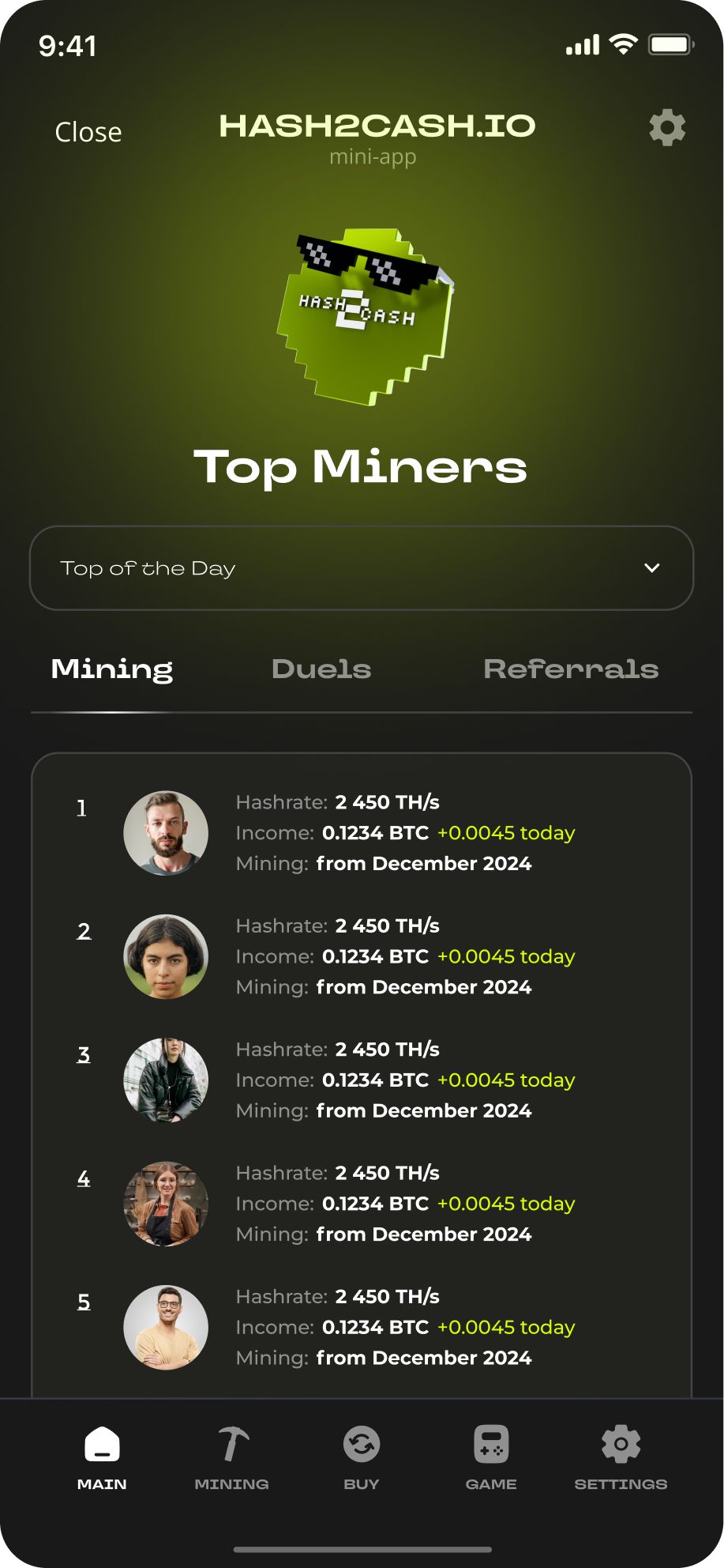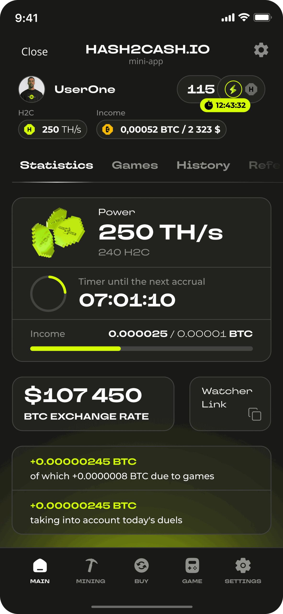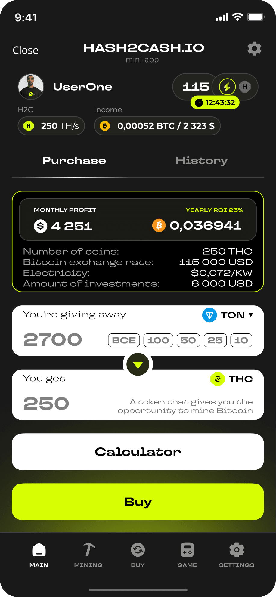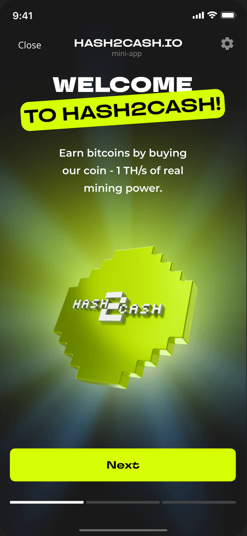 Покупайте токены H2C (каждый из которых обеспечен реальным хешрейтом 1 TH/s) прямо внутри Telegram и получайте ежедневные вознаграждения в BTC — без дорогостоящего оборудования, сложной настройки и обслуживания.