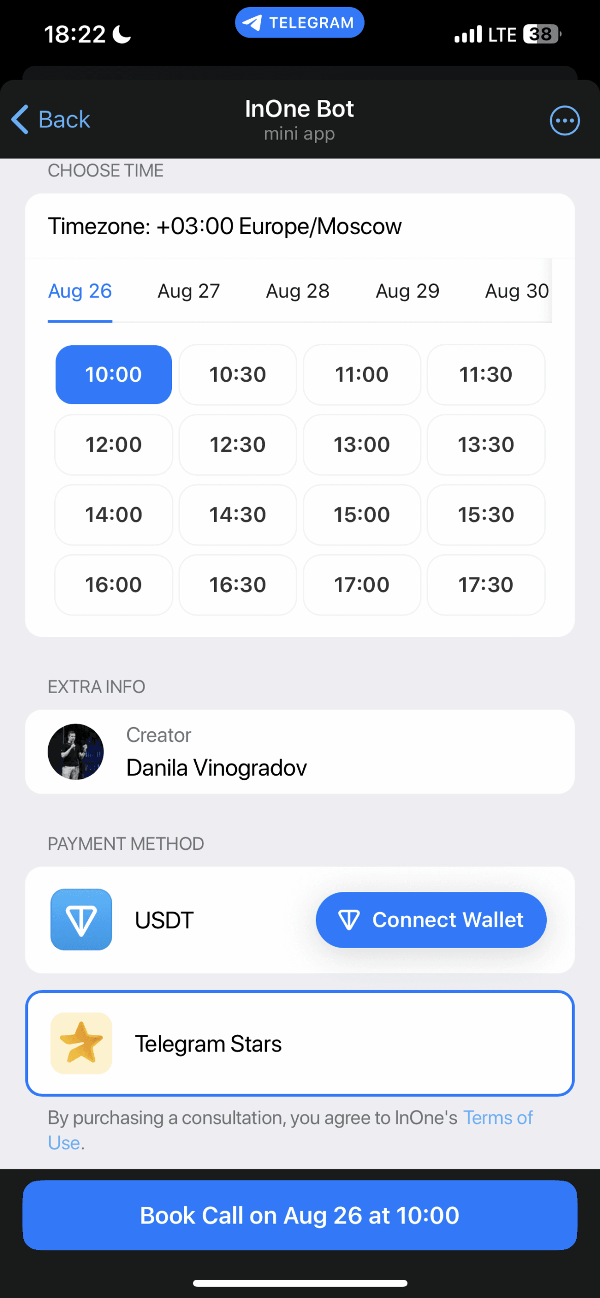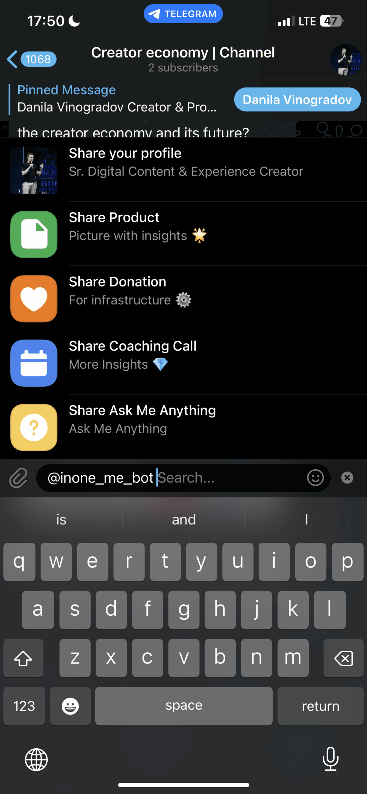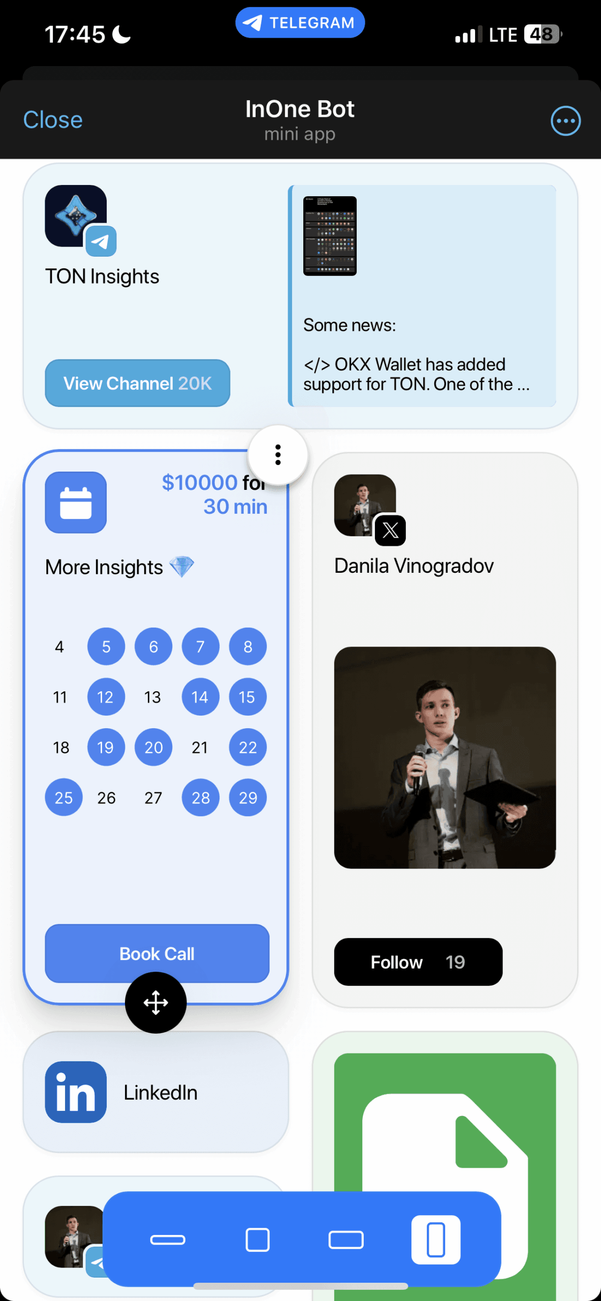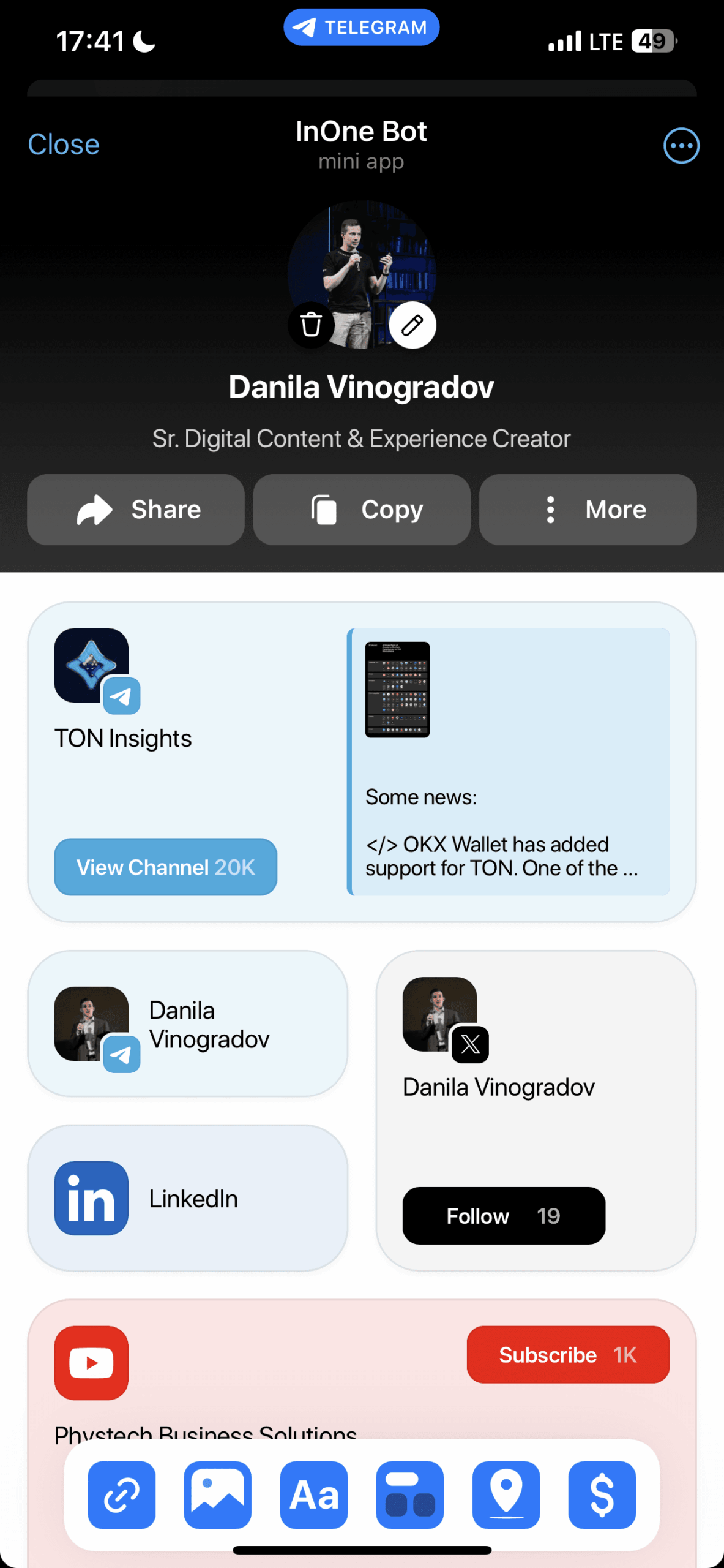 InOne — это платформа без кода для создания веб-сайтов в стиле Apple непосредственно в Telegram. Совершенно бесплатно и всего за несколько кликов каждый может создать изящную цифровую визитную карточку и начать продавать цифровые продукты, предлагать консультации, отвечать на вопросы или принимать пожертвования. Он создан так, чтобы напоминать виджеты Apple, и это сделано намеренно. Создатели могут начать зарабатывать деньги, взимая простую комиссию в размере 10 % со всех транзакций, совершаемых через виджеты монетизации. Платежи в настоящее время обрабатываются через Telegram Stars и TON Connect.