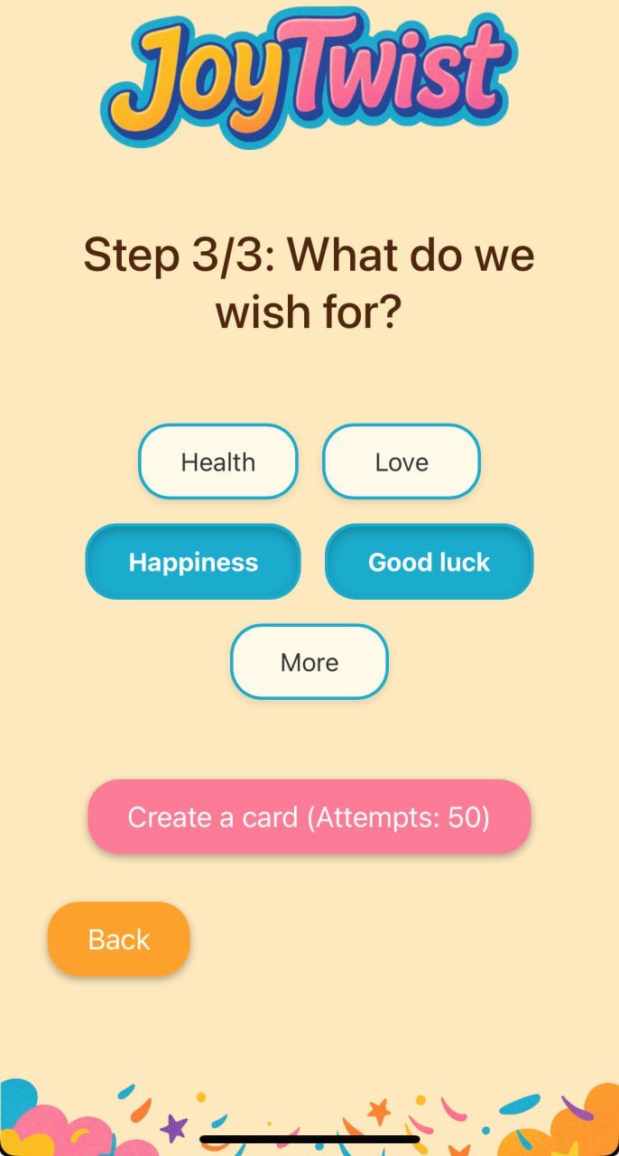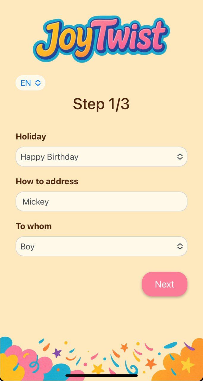 Создатель поздравительных открыток на базе искусственного интеллекта. JoyTwist — это мини-приложение Telegram, которое использует искусственный интеллект для мгновенного создания персонализированных поздравительных открыток. Он создает как уникальное изображение, так и искреннее послание на языке пользователя, что позволяет легко отпраздновать любое событие с индивидуальным подходом.
