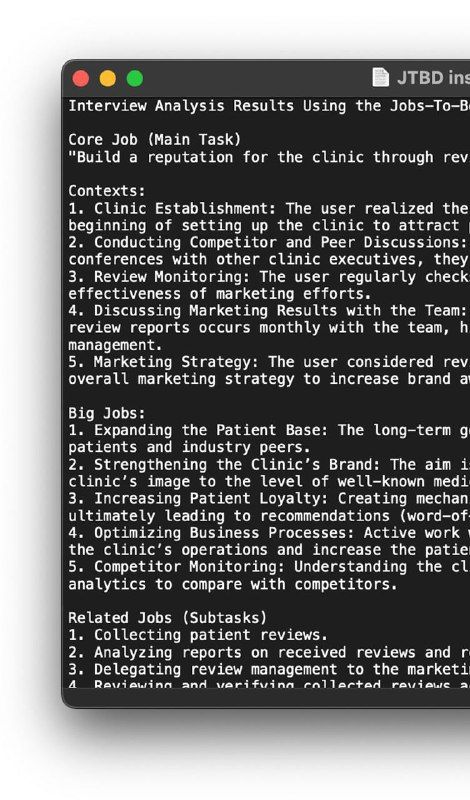 Анализирует интервью по продукту и получает информацию на основе структуры JTBD. Он определяет основные профессии, контексты, страхи и связанные с ними вакансии в отзывах пользователей, помогая вам раскрыть то, что действительно движет вашей аудиторией.