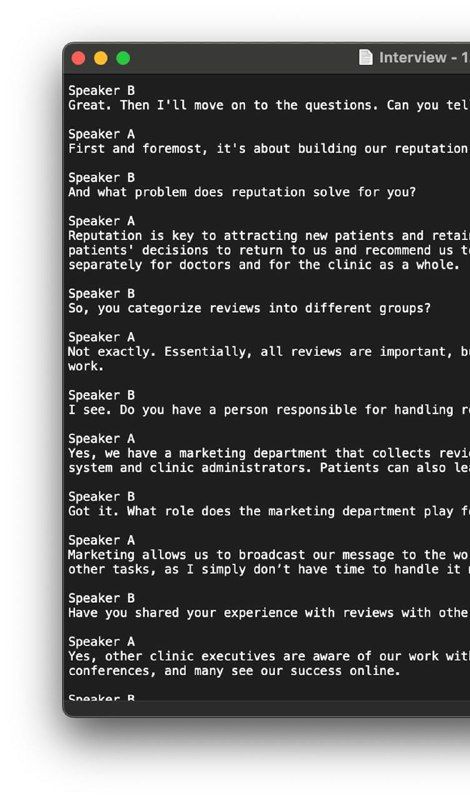 Расшифровывает аудиозапись интервью. Он транскрибирует записи интервью в текст, разделенный по спикерам, что позволяет легко следить за каждым потоком разговора.