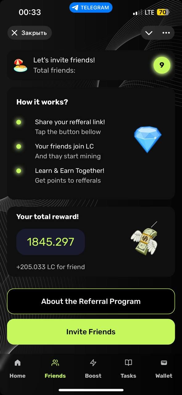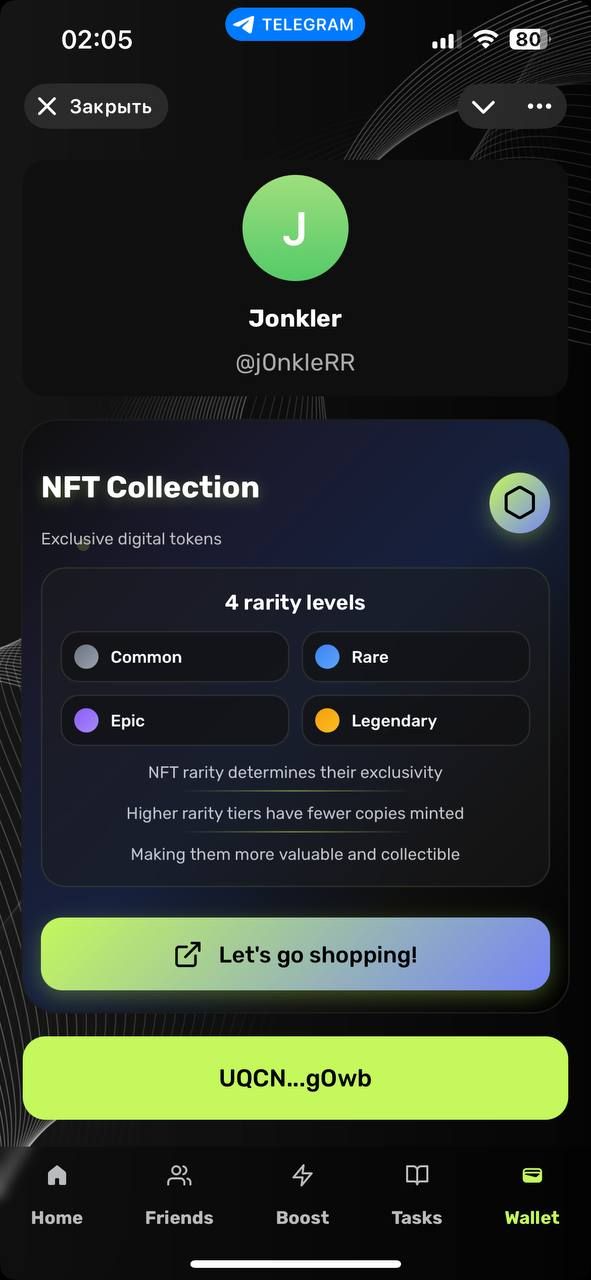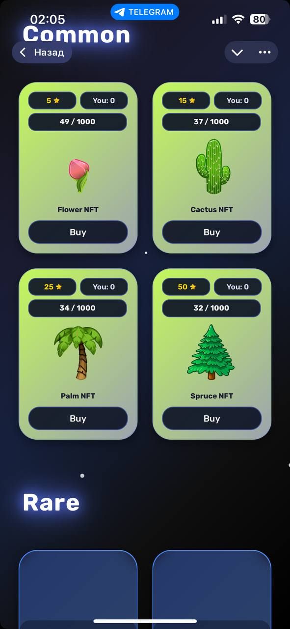 Telegram, целью которого является создание совершенно новой криптовалюты в блокчейне TON. В нашем приложении вы можете купить бустеры для пассивного майнинга или NFT, чтобы увеличить количество своих токенов в списке.