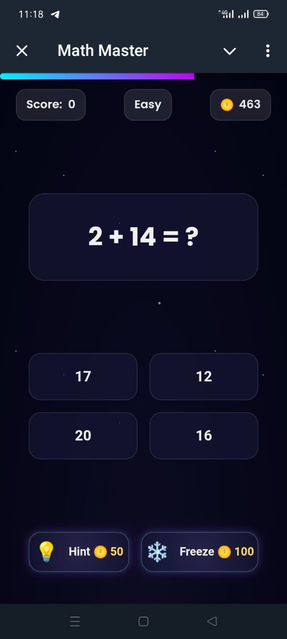 Добро пожаловать в Math Master, лучшую мини-игру для Telegram, в которой числа встречаются с удовольствием! Соревнуйтесь со временем, решая быстрые математические задачи и развивая свои умственные способности. Независимо от того, являетесь ли вы обычным игроком или математическим гением, каждый уровень предназначен для того, чтобы бросить вызов и улучшить вашу умственную ловкость. Готов стать настоящим учителем математики