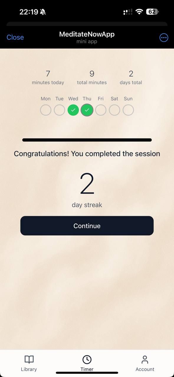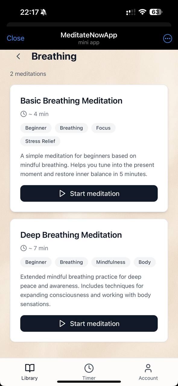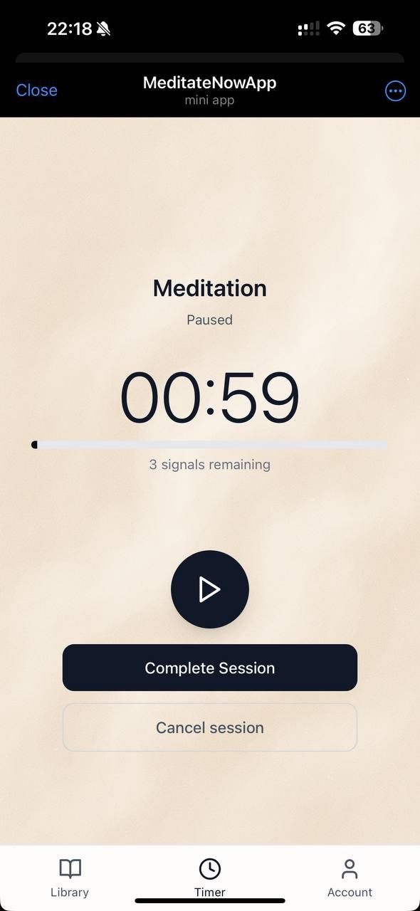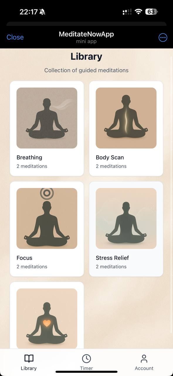 MeditateNow — таймер для медитации, который работает прямо в Telegram, не требуя дополнительных загрузок. Приложение предоставляет настраиваемые сеансы медитации с фоновыми звуками, такими как дождь, океанские волны и тибетские поющие чаши.