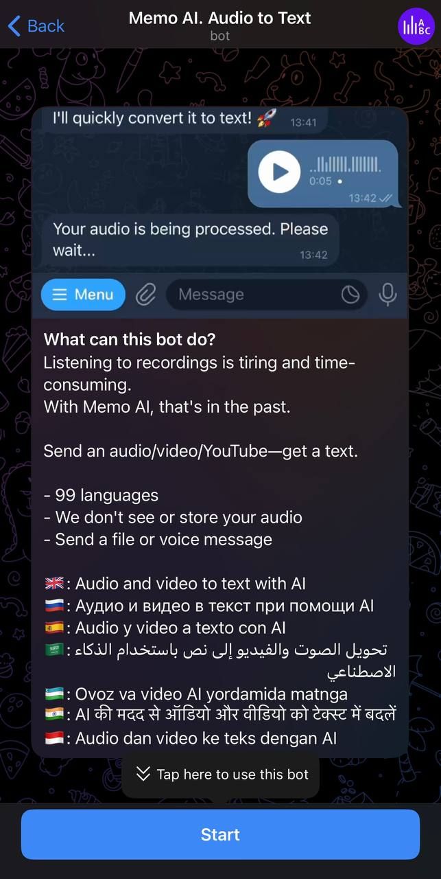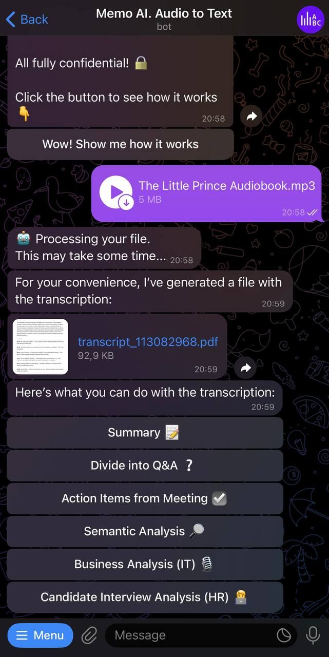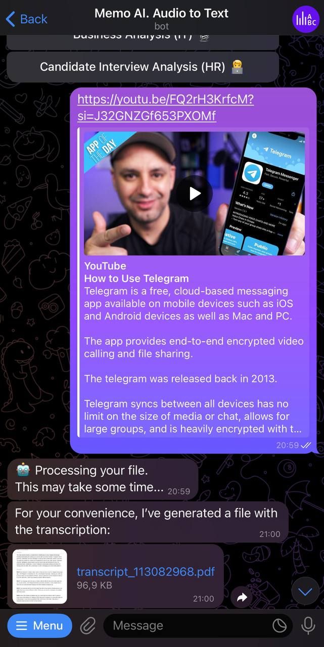 Встречайте Memo AI — вашего помощника на базе искусственного интеллекта, который мгновенно превращает любое аудио или видео в точный текст — и все это в Telegram. От голосовых заметок и видеоклипов до ссылок на YouTube — Memo AI обрабатывает их за считанные секунды. Но это еще не все: вы также получаете краткие резюме, расширенный семантический анализ и другие специализированные инструменты для широкого круга специалистов!