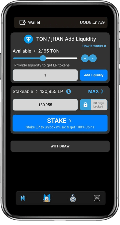 MusiKhan — это мини-приложение Telegram для зарабатывания денег, созданное на основе Music RWAfi от HanChain, где пользователи делают ставки токенами LP, чтобы разблокировать треки K-POP, транслировать музыку и получать вознаграждения HAN через игры Spin.