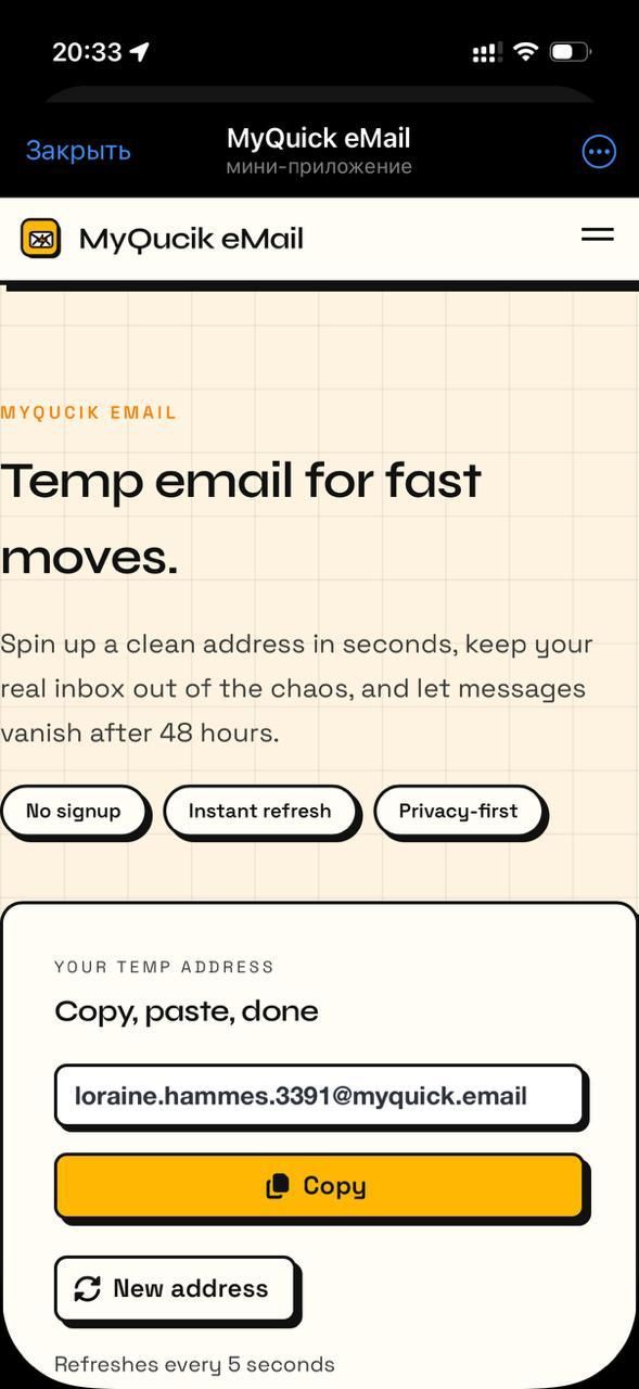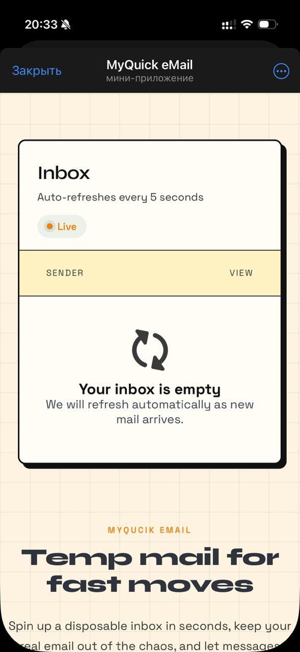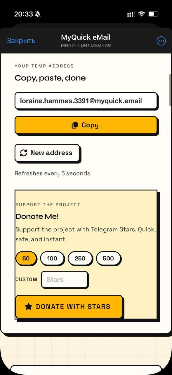 MyQuick Temp eMai позволяет вам создать чистый временный почтовый ящик прямо внутри Telegram.