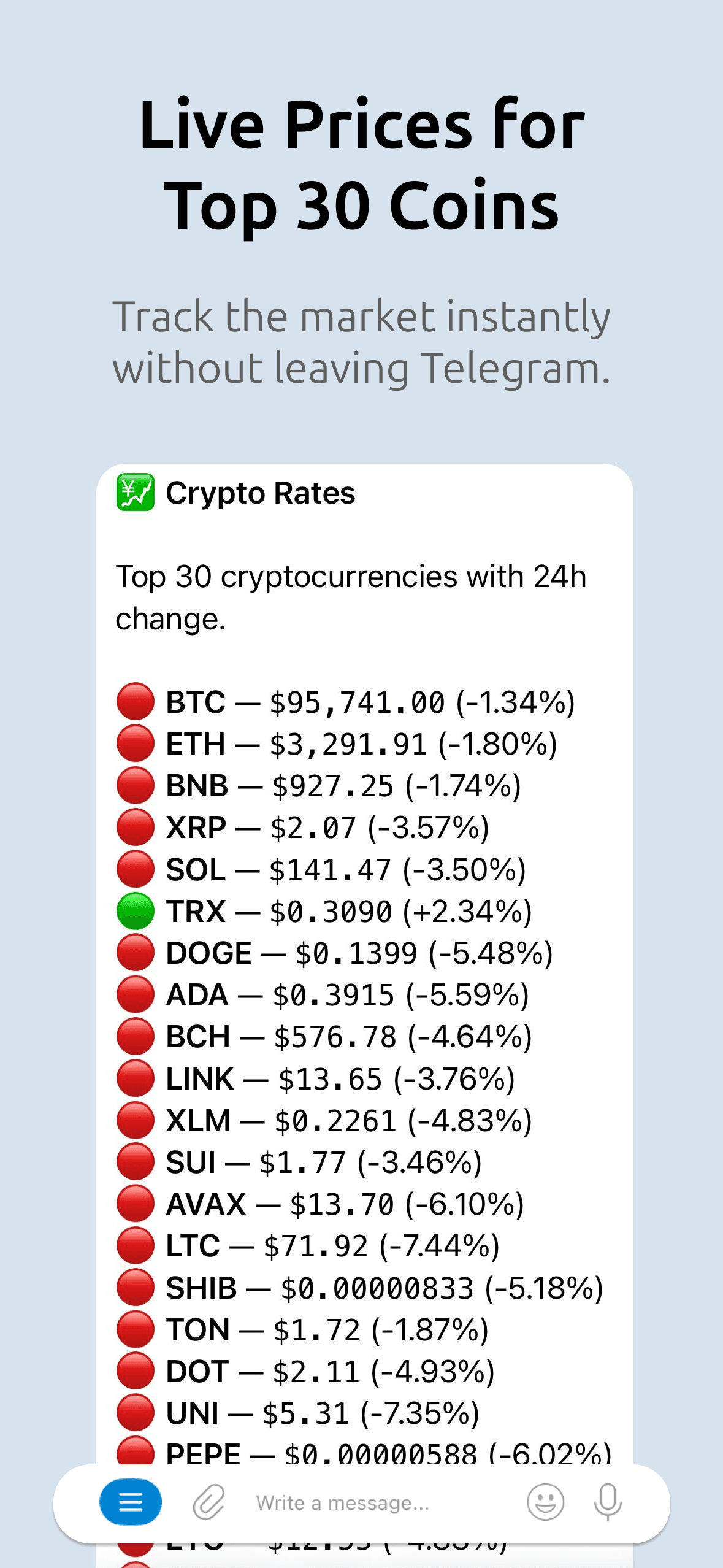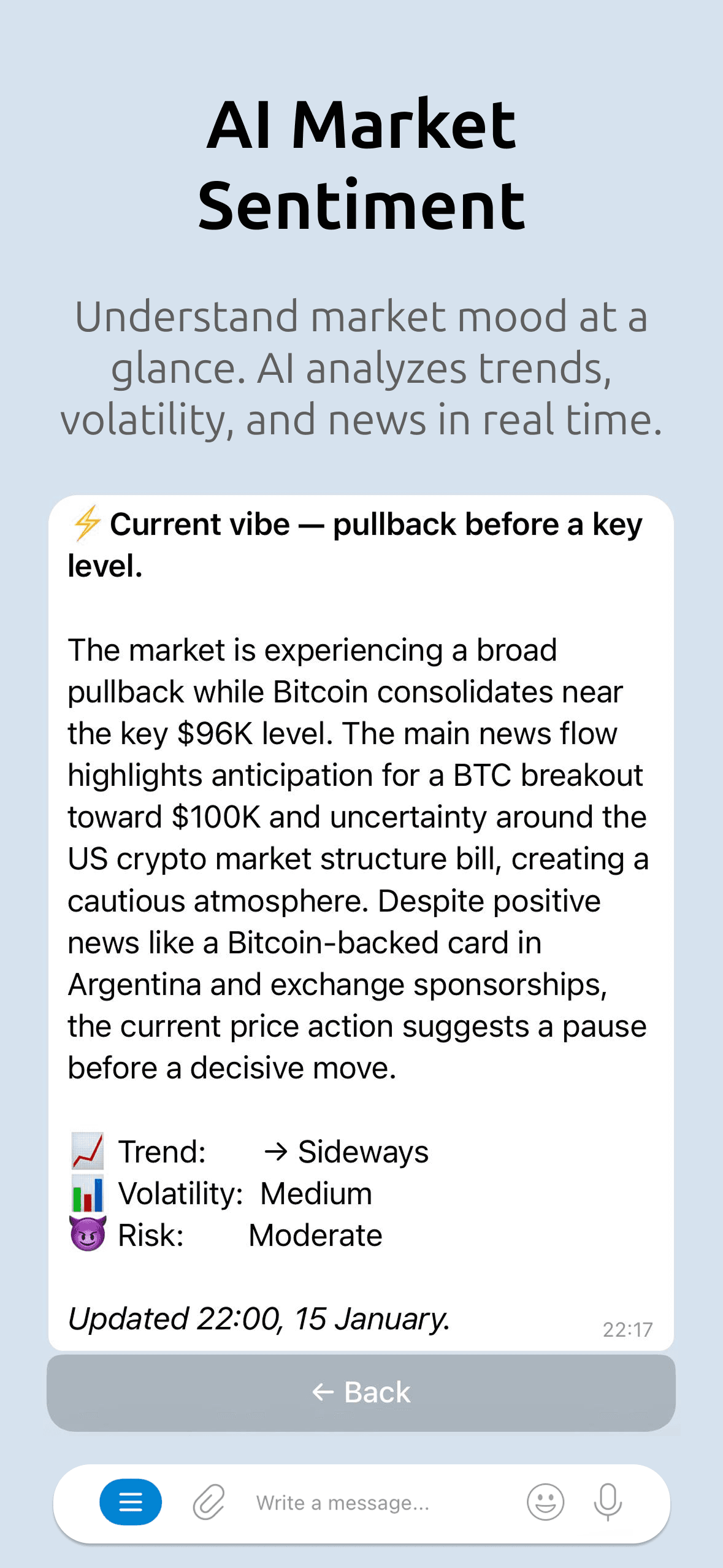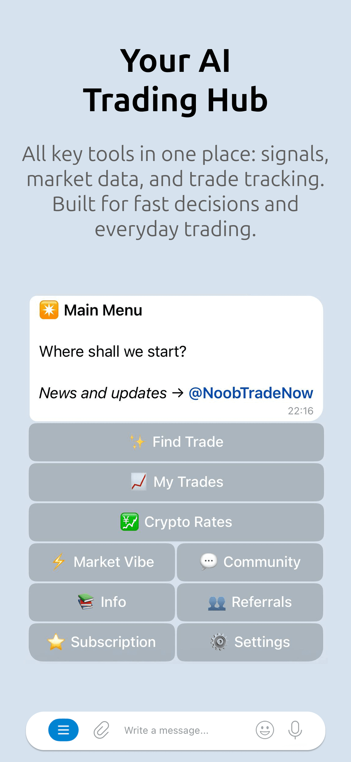 NoobTrade Now предоставляет торговые сигналы на основе искусственного интеллекта для 30 лучших монет, включая BTC, ETH, SOL и TON. Каждая настройка включает точные точки входа, цели тейк-профита и уровни стоп-лосса на основе технического анализа в реальном времени и новостей рынка. Функции включают в себя ежедневные рыночные дайджесты, отслеживание PnL в реальном времени для сохраненных сделок, панель мониторинга курсов криптовалют и сообщество частных трейдеров. Подписка доступна через Telegram Stars с 7-дневной бесплатной пробной версией. Двуязычная поддержка (английский/русский). NoobTrade Now — ваш умный торговый помощник прямо в Telegram.