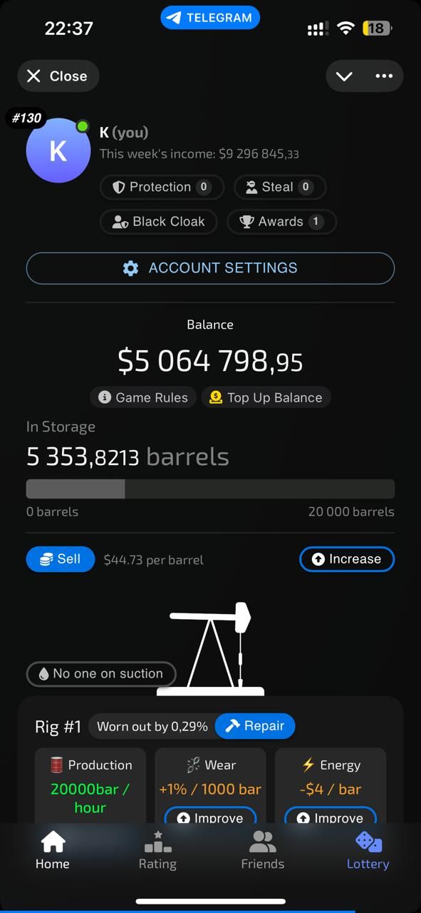 Oil — это стратегическая игра, в которой игроки добывают нефть и торгуют ею, чтобы построить свою империю. Бурите нефть, модернизируйте буровые установки, чтобы увеличить добычу, и продавайте по лучшей рыночной цене. Соревнуйтесь с другими игроками в еженедельных таблицах лидеров и станьте самым богатым нефтяным магнатом.