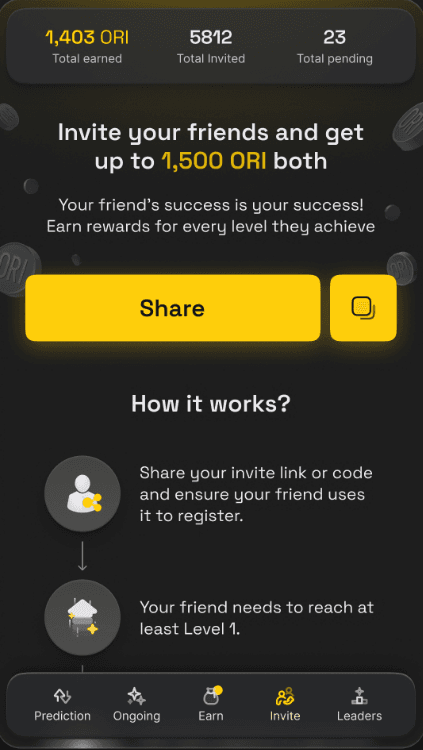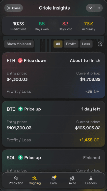 Мини-приложение — это облегченная версия платформы прогнозирования Oriole Insights, интегрированная непосредственно в Telegram. Никаких сложных шагов — проводи, предсказывай и выигрывай!