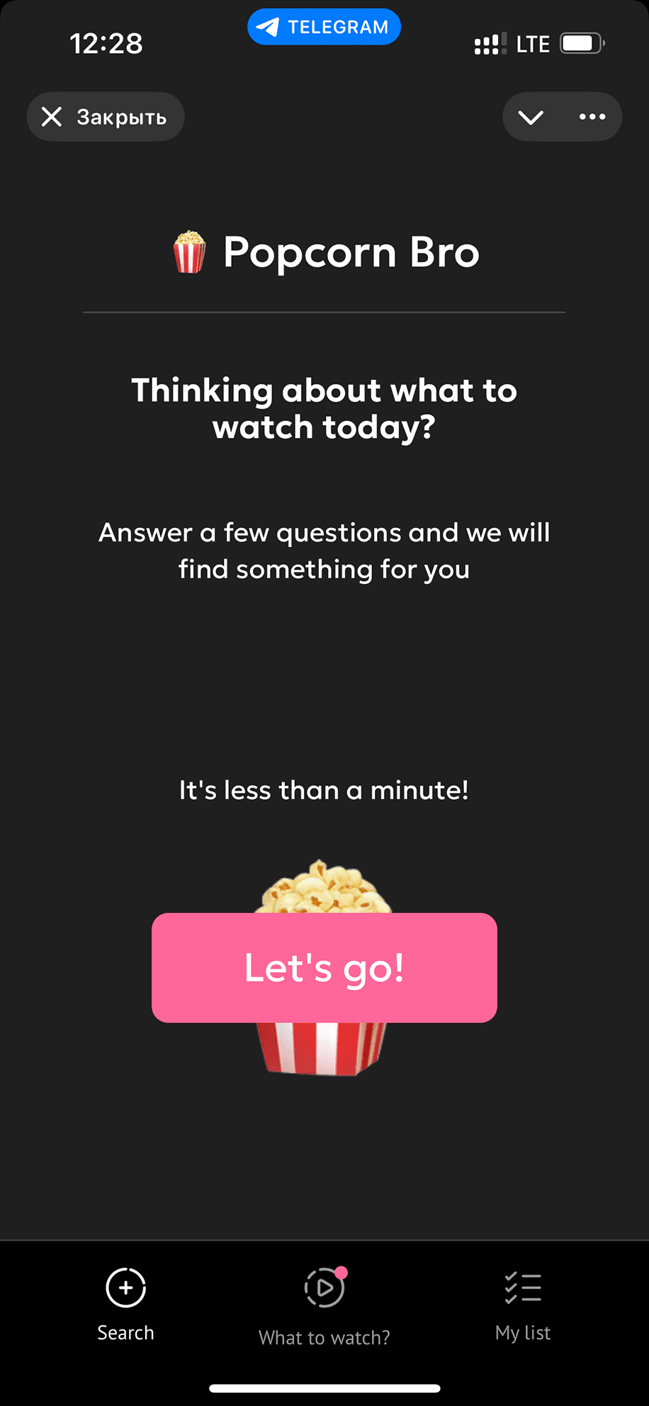 Popcorn Bro может ответить на самый сложный вопрос во вселенной — что смотреть. Он порекомендует вам лучшие фильмы и сериалы из тысяч вариантов. Просто ответьте на несколько вопросов, и вы получите подборку, идеально соответствующую вашему настроению. Со временем бот узнает ваши вкусы и предоставит еще более персонализированные рекомендации.