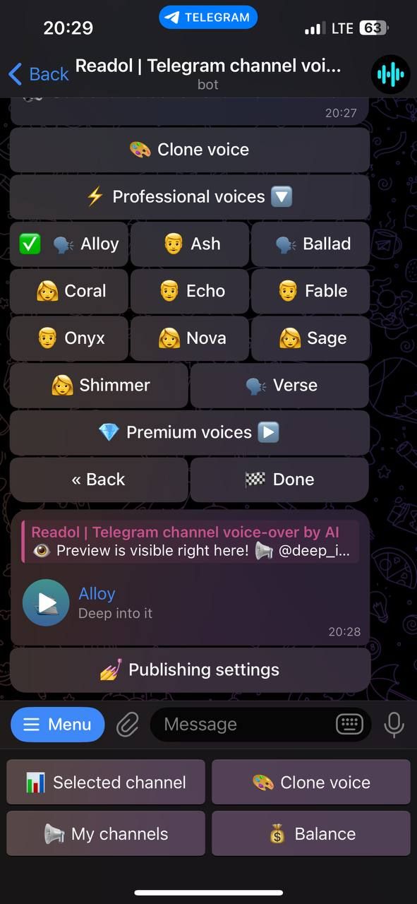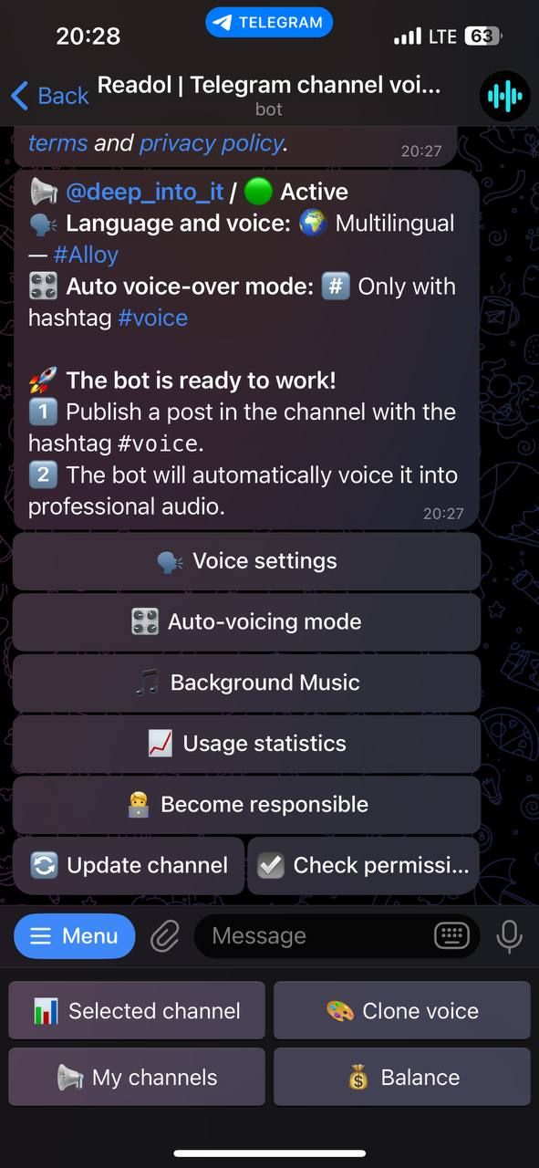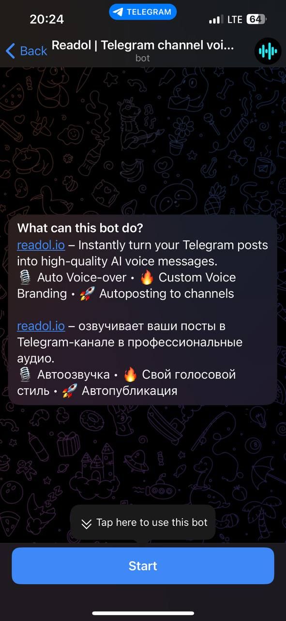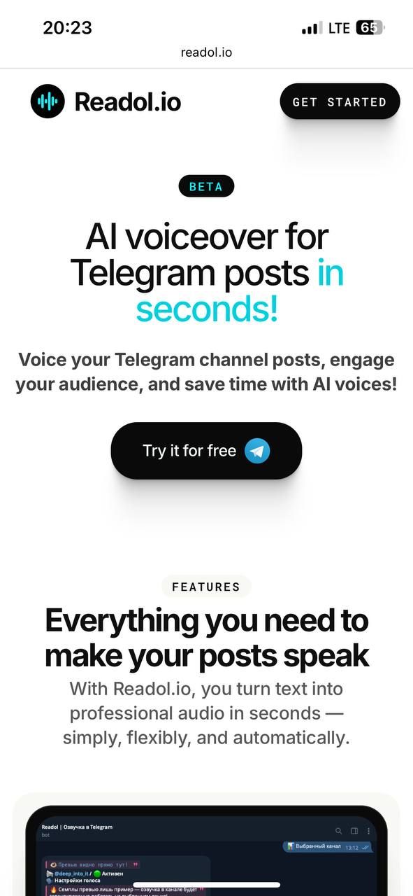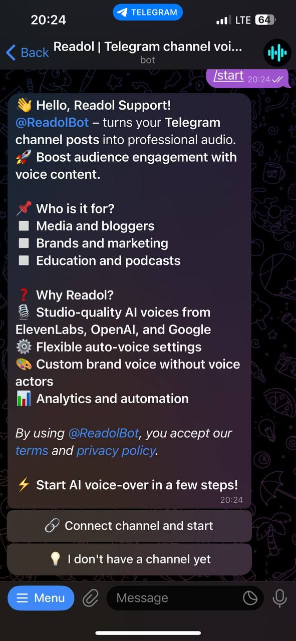 Readol превращает текстовые сообщения вашего канала Telegram в профессиональные голосовые сообщения, используя современные голоса искусственного интеллекта. Благодаря передовым технологиям преобразования текста в речь, таким как ElevenLabs, OpenAI и Google TTS, он обеспечивает естественное звучание аудиоконтента за считанные секунды — просто, гибко и автоматически.