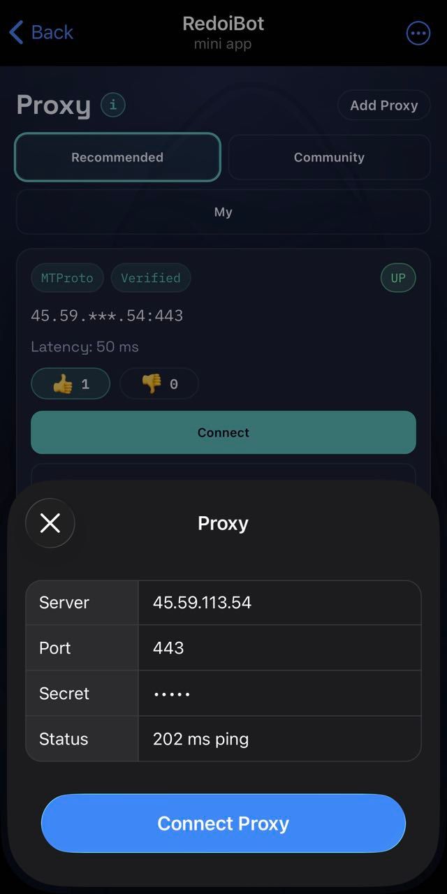 Оставайтесь на связи через прокси-сеть, оцененную сообществом, которая помогает пользователям Telegram поддерживать доступ в нестабильных или ограниченных средах. Откройте для себя серверы MTProxy, добавьте свои собственные и оцените надежность вместе с другими участниками.
