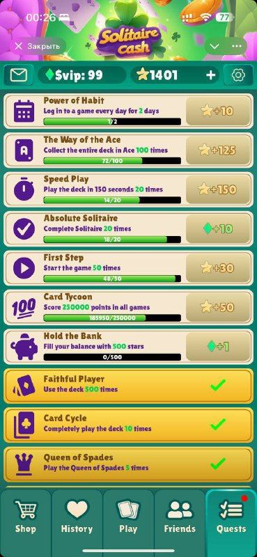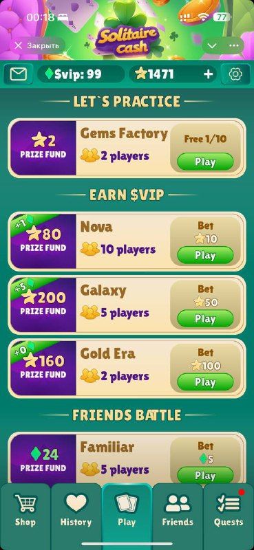 Классический пасьянс в Telegram! Участвуйте в асинхронных PvP-матчах, зарабатывайте VIP-очки и открывайте VIP-привилегии. Идеально подходит для быстрых игр в любое время и в любом месте!
