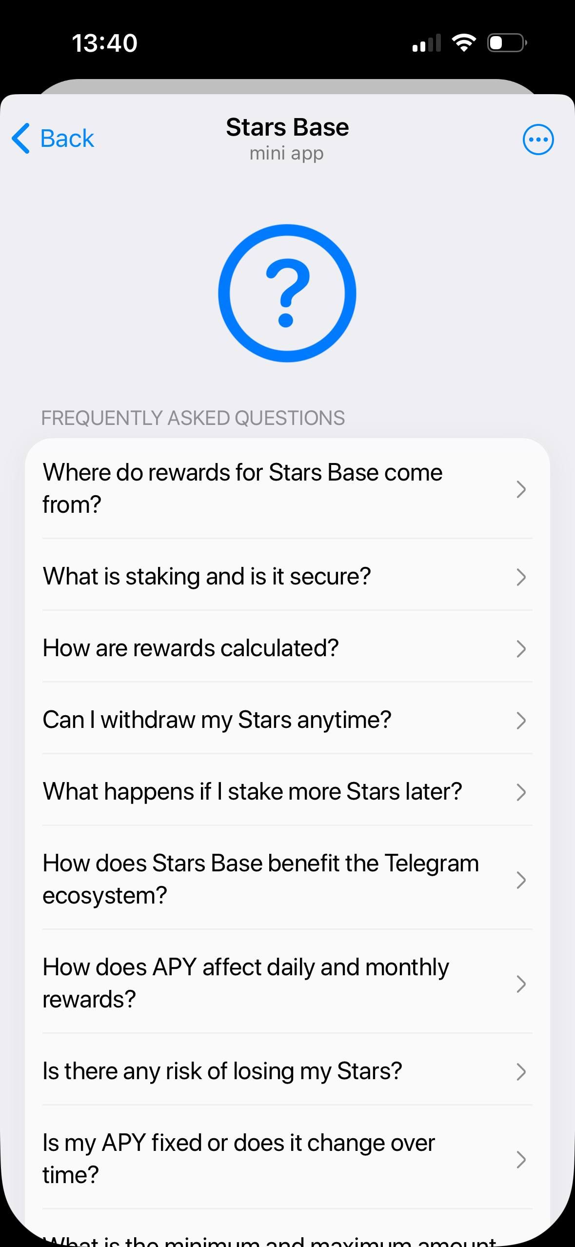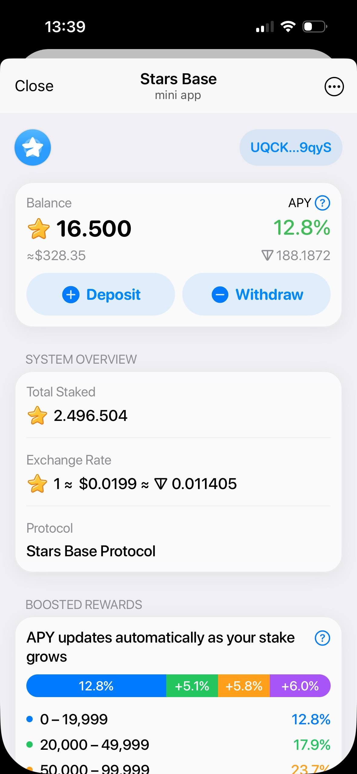 Независимо от того, делаете ли вы ставку впервые или управляете крупными активами, Stars Base обеспечивает защиту институционального уровня, точное отслеживание вознаграждений и гибкие возможности вывода средств. Выводите средства в звездах или TON, отслеживайте свои доходы в режиме реального времени и наслаждайтесь преимуществами системы, предназначенной для устойчивого роста и стабильности ликвидности в экосистеме Telegram Stars.