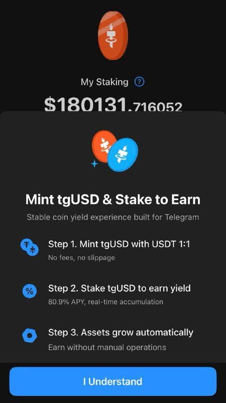 Telegram USD (tgUSD) — это доходный стейблкоин, специально созданный для пользователей Telegram. Полностью обеспеченный в соотношении 1:1 активами «голубых фишек», такими как USDT, tgUSD позволяет вам чеканить, хранить и передавать стабильную стоимость в экосистеме Telegram — совместимо с любым кошельком TON.