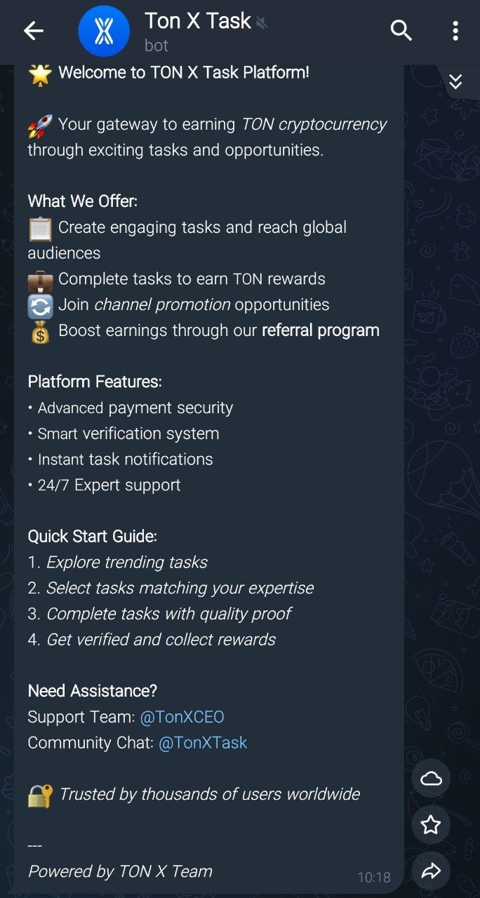 $$TON X Task Manager Bot позволяет вам нанимать тысячи реальных пользователей для выполнения любого типа задач или работы.
