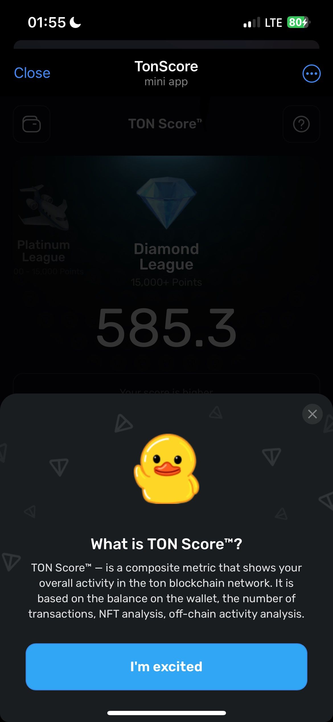 TON Score — это платформа, которая позволяет вам исследовать проекты в экосистеме TON и зарабатывать на них. Подключив свой кошелек, вы можете получать персонализированную оценку на основе ваших транзакций, активов, токенов, NFT и многого другого. Ваш результат обновляется каждые 3 дня, что позволяет вам отслеживать свой прогресс и зарабатывать больше очков. Удержание определенных партнерских жетонов открывает специальные бонусы. TON Score ориентирован на вознаграждение реальных и активных пользователей и предназначен для улучшения того, как люди учатся и взаимодействуют с экосистемой TON.