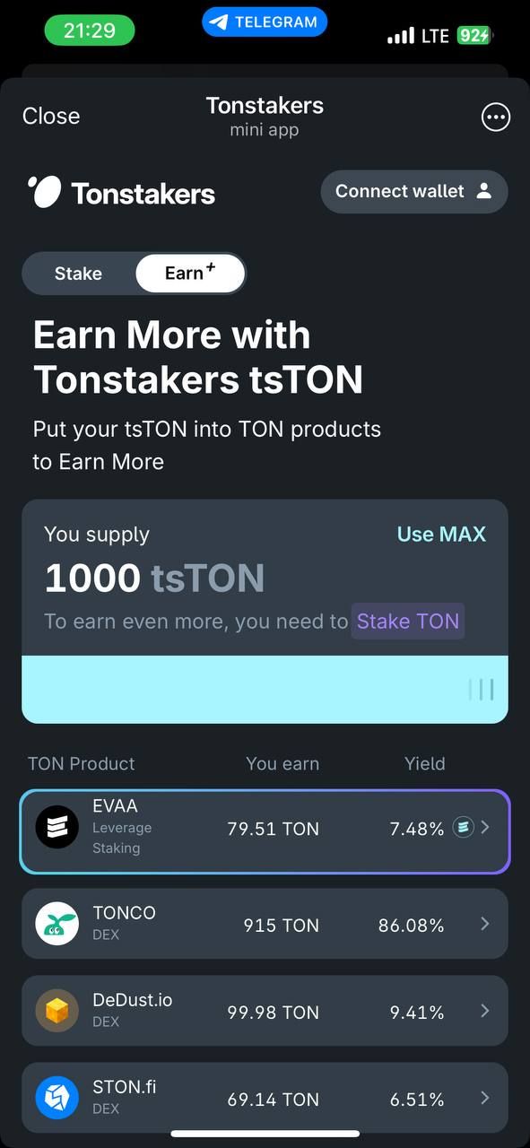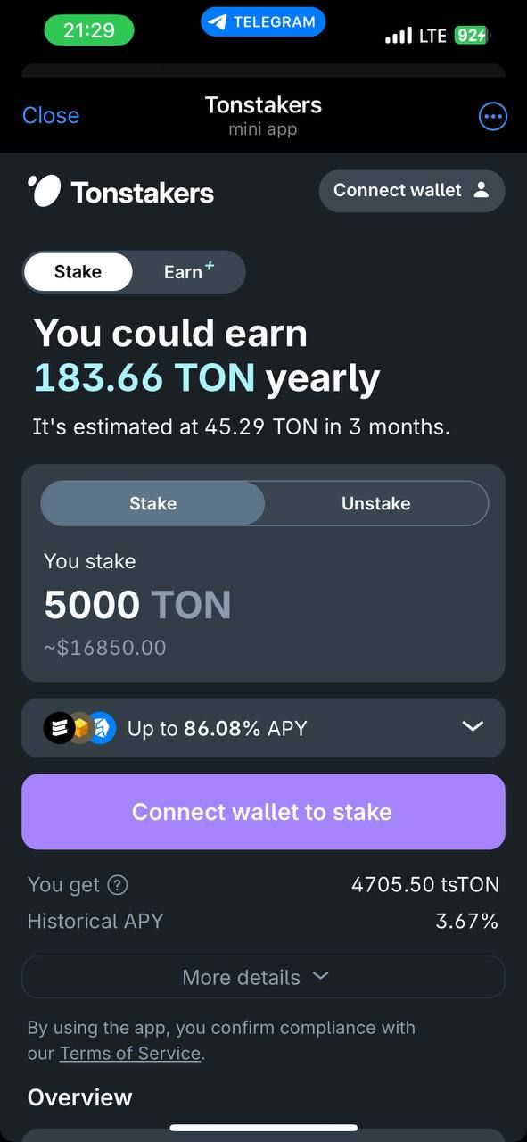 Мини-приложение Tonstakers позволяет делать ликвидные ставки на TON, предлагая высокие вознаграждения APY и доступность активов. Разработанный совместно с разработчиками TON Core и проверенный Certik, он обеспечивает безопасный стейкинг без посредников. Пользователи могут вносить TON, получать токены tsTON (представляющие доли пула) и зарабатывать вознаграждения, а также иметь возможность в любое время вывести свой первоначальный TON плюс доход.