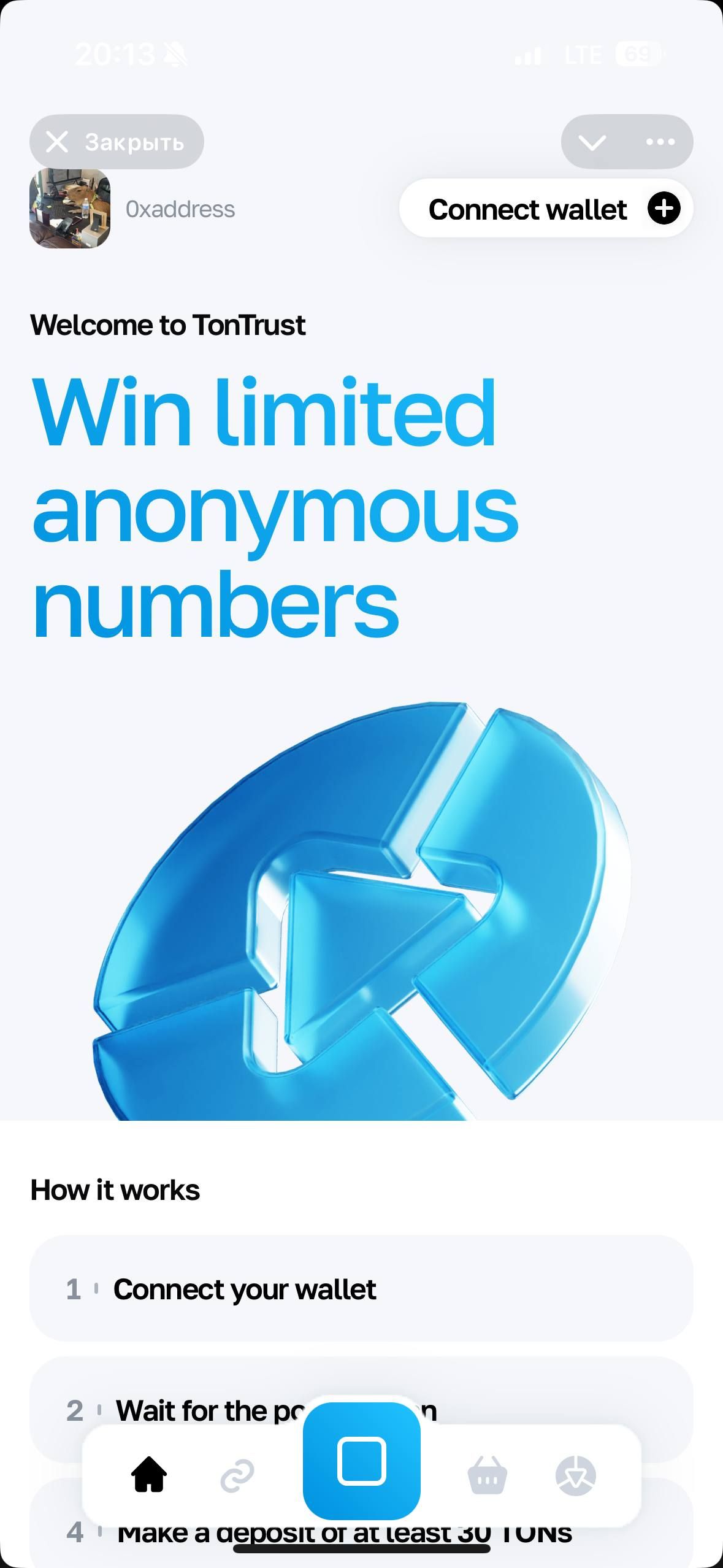 Первая платформа, предлагающая анонимные коллекционные номера Telegram. Проект сочетает в себе самые сложные аспекты блокчейна TON и технологии SIM. Доверяя нам, вы доверяете себе — полный контроль в ваших руках, вашем кошельке и вашем TonTrust NFT!