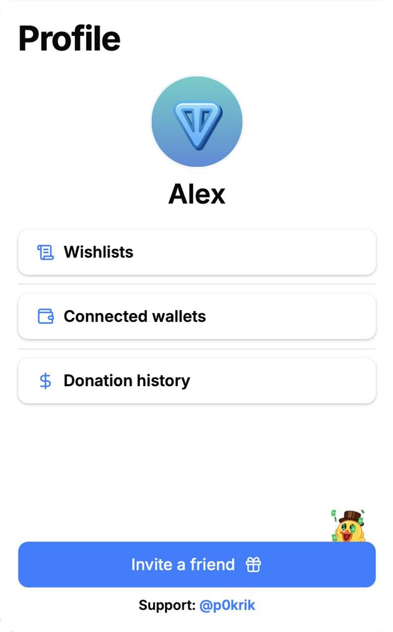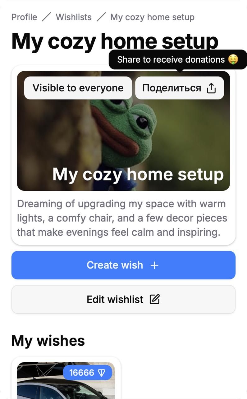 TONWishy — это мини-приложение Telegram, которое позволяет пользователям создавать списки желаний, делиться своими целями и получать прямые пожертвования в TON. Он предлагает простой и прозрачный способ для авторов, блоггеров и обычных пользователей получить поддержку своей аудитории без посредников.
