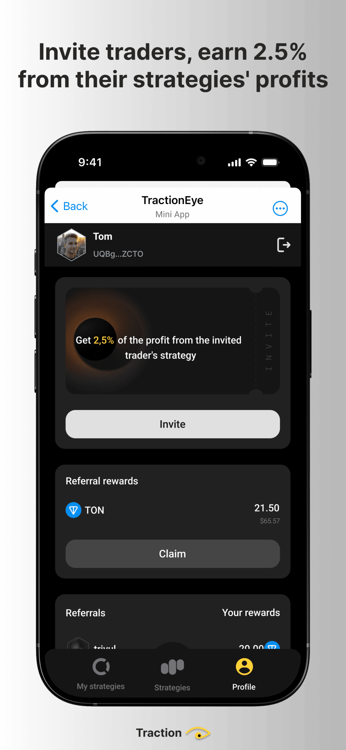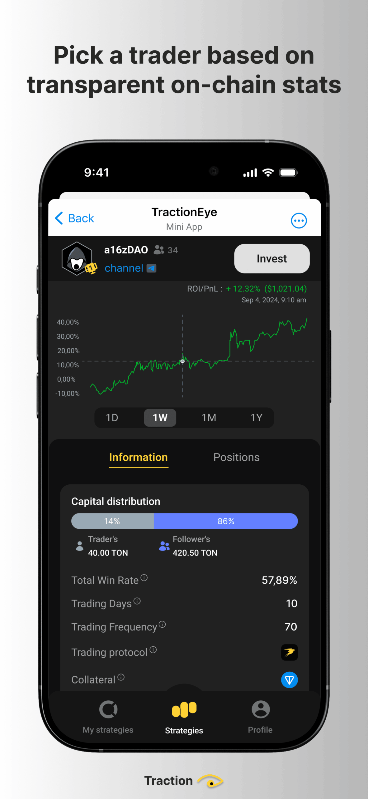 Получите доступ к экспертным стратегиям трейдеров OG и без труда получайте прибыль от их успешных сделок. TractionEye совершает революцию в торговле DeFi, объединяя сообщества и трейдеров OG в мощную команду — фонд. Вместо бесконечной погони за китами члены сообщества становятся поставщиками ликвидности для фонда, управляемого трейдером, а прибыль делится между всеми участниками!