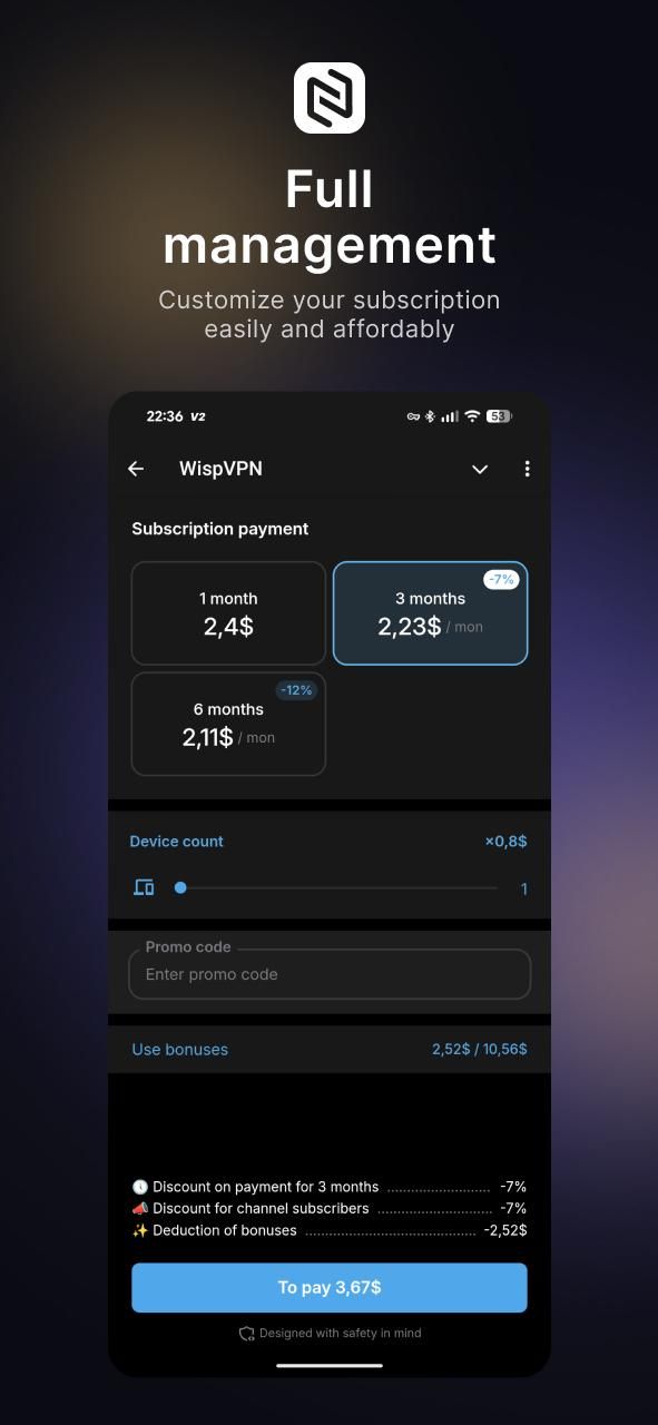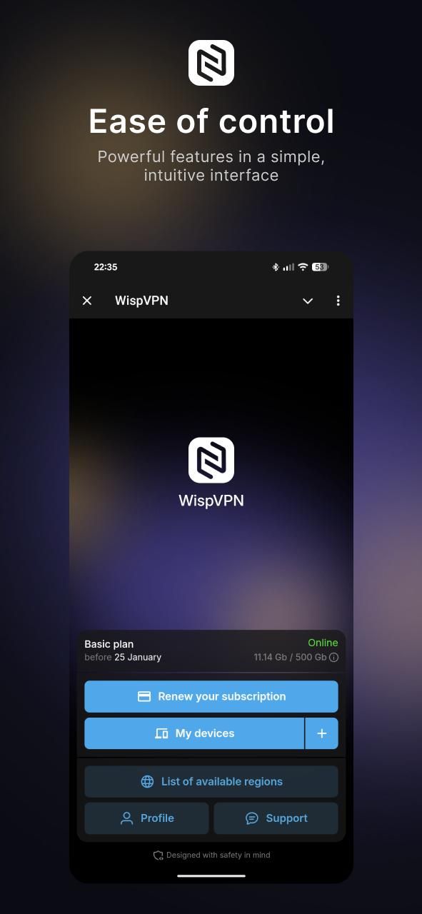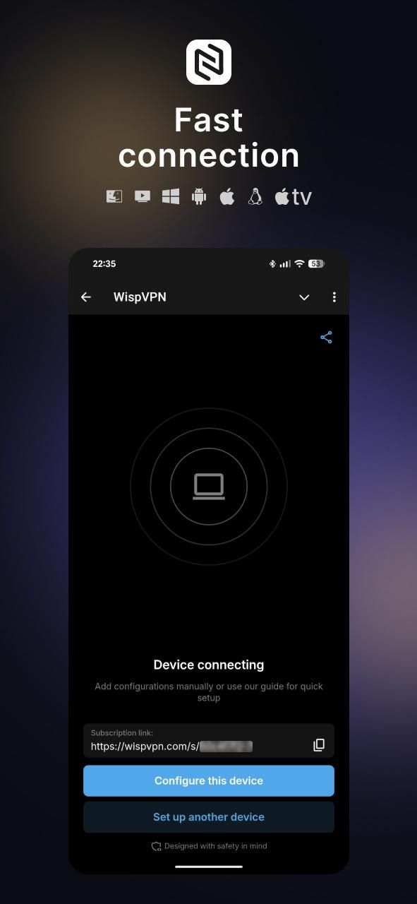 WispVPN — это простой и надежный способ оставаться на связи без ограничений. Настройка занимает всего минуту, и вы можете без проблем настроить подключение на любом устройстве. Мы не храним логи, не собираем персональные данные и не замедляем ваш интернет — только стабильный, быстрый и защищенный доступ к нужным вам сайтам и приложениям.